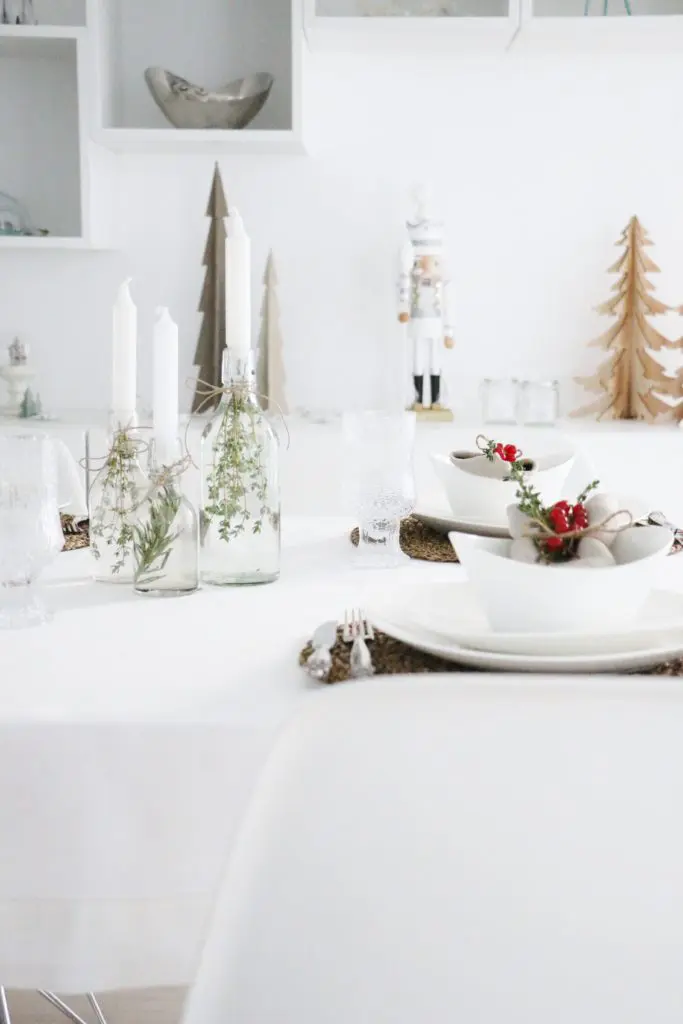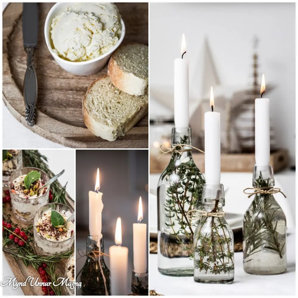 Ég setti rósmarín og tímian í flöskur og batt svo snæri um hálsinn á þeim og setti kerti í. Mér finnst þetta ótrúlega jólalegt og fallegt og enn fallegra þegar byrjað er að rökkva og kveikt er á kertunum.
