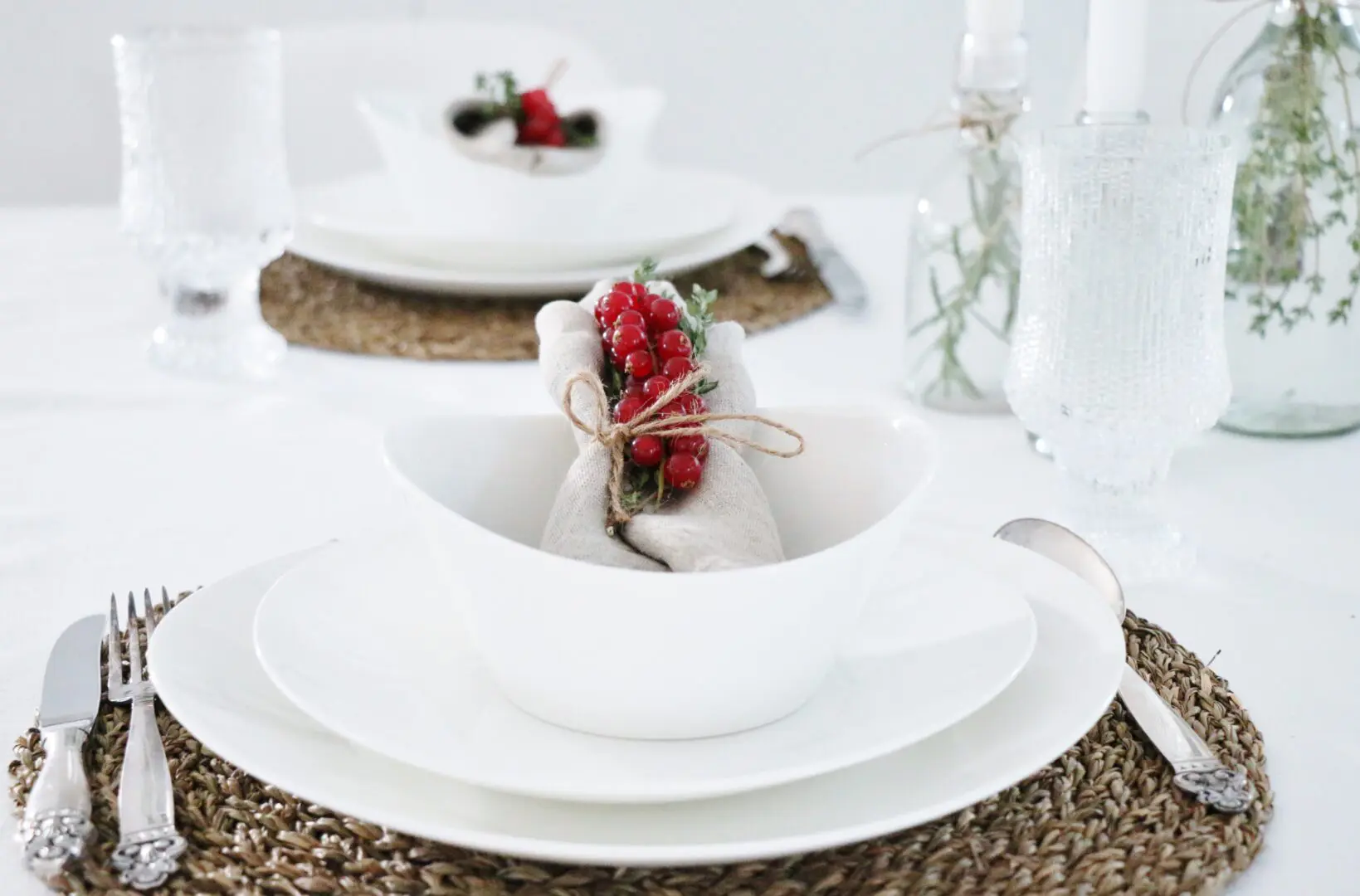Ég notast við fallegar og náttúrulegar tauservíettur og set á þær rifsber og timian greinar sem ég bind svo saman með snæri í stíl við það sem ég setti á flöskurnar.