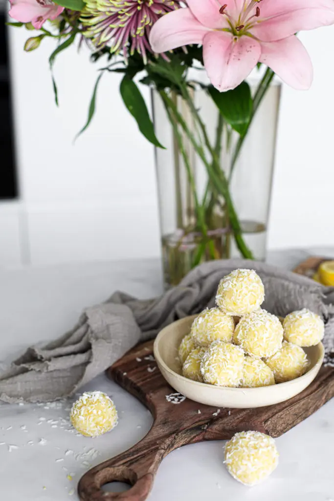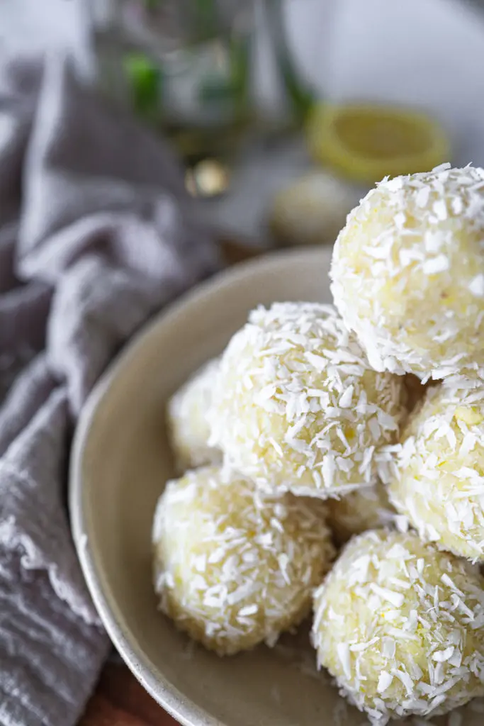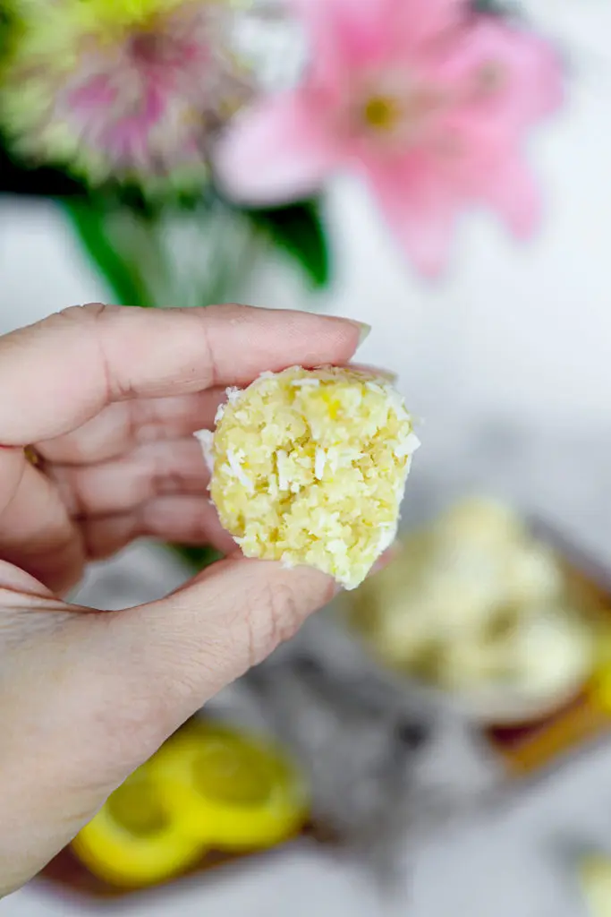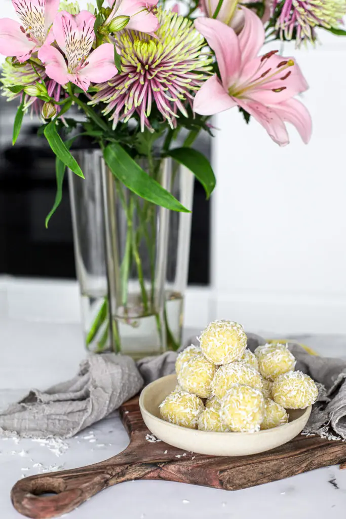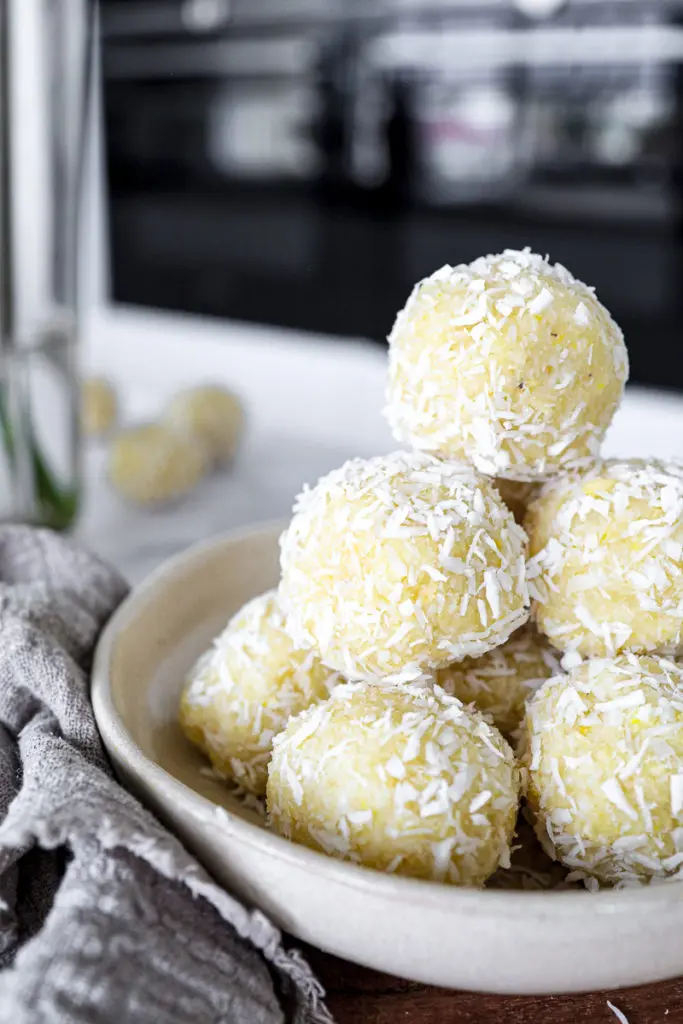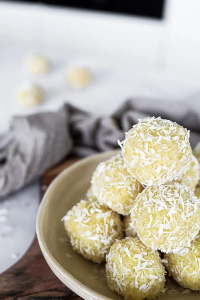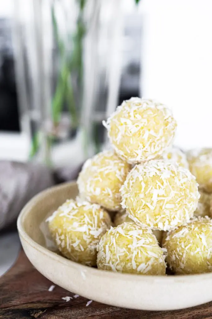 - Passið að mauka ekki of mikið heldur þá verður það að smjöri, mótið nú kúlur úr massanum og veltið upp úr kókósmjöli (ekki hafa áhyggjur ef ykkur finnst þær linar því þær stífna í ísskáp)