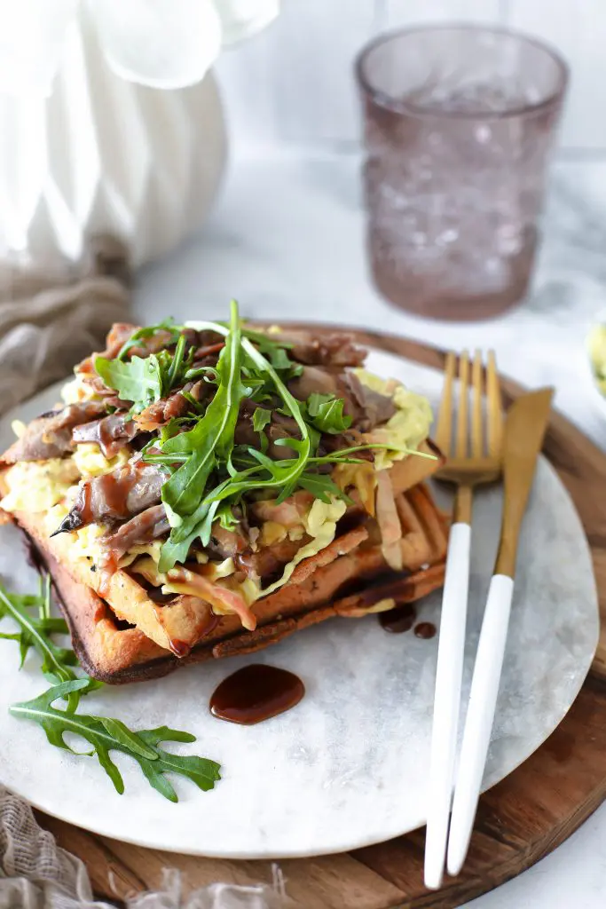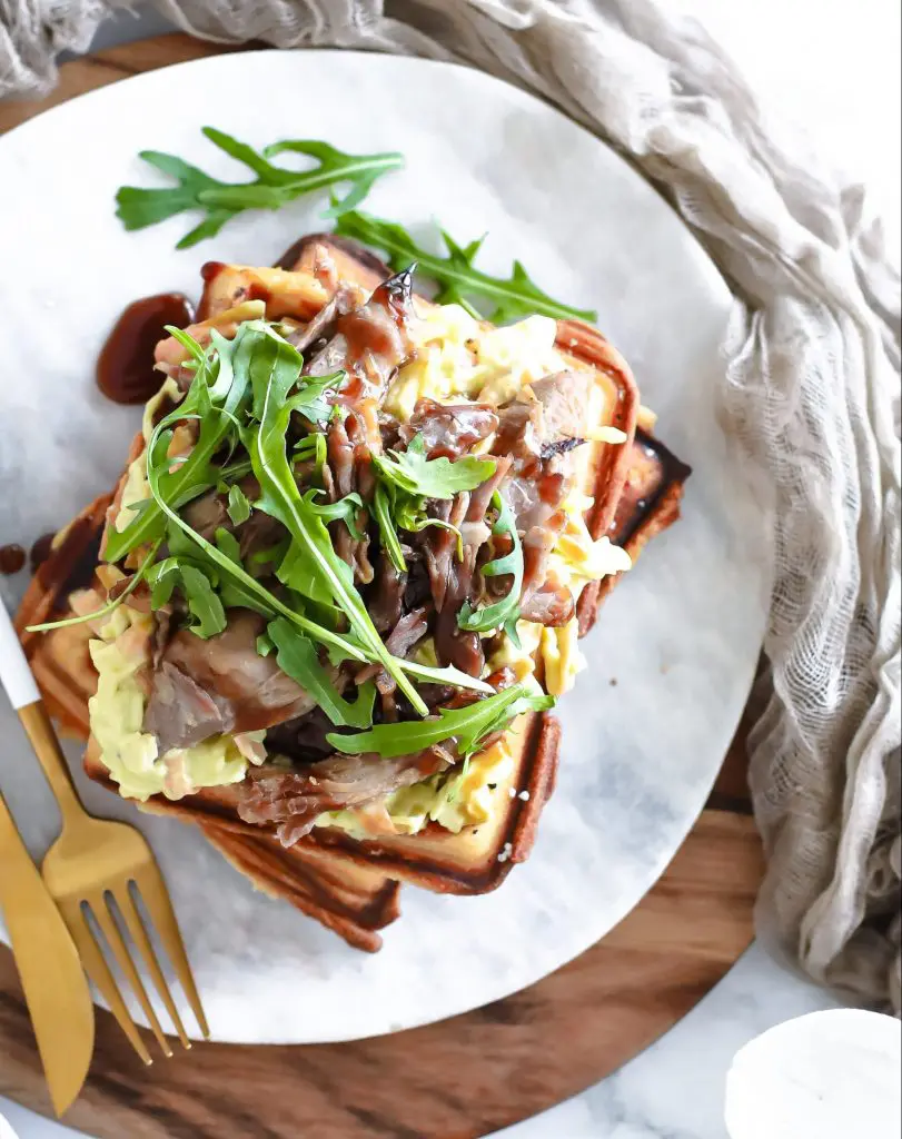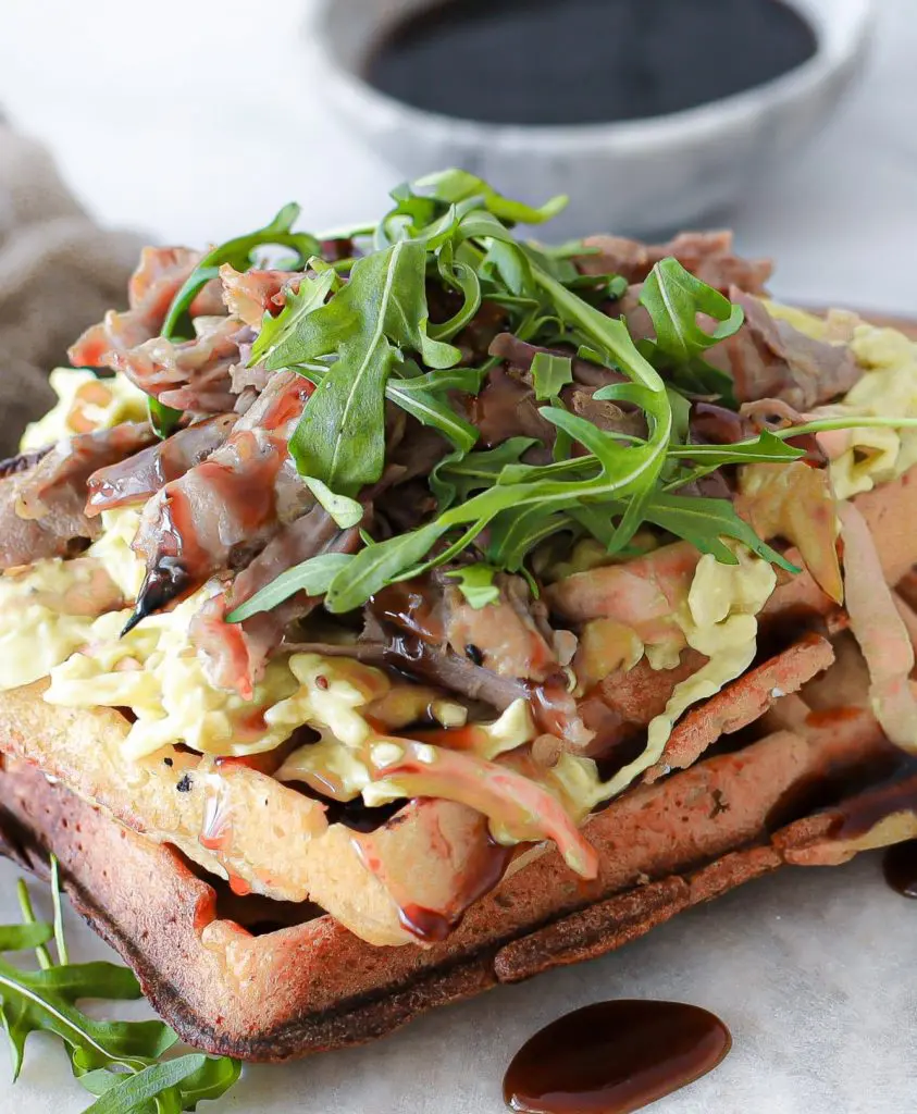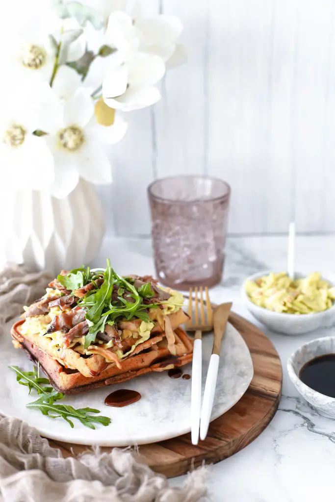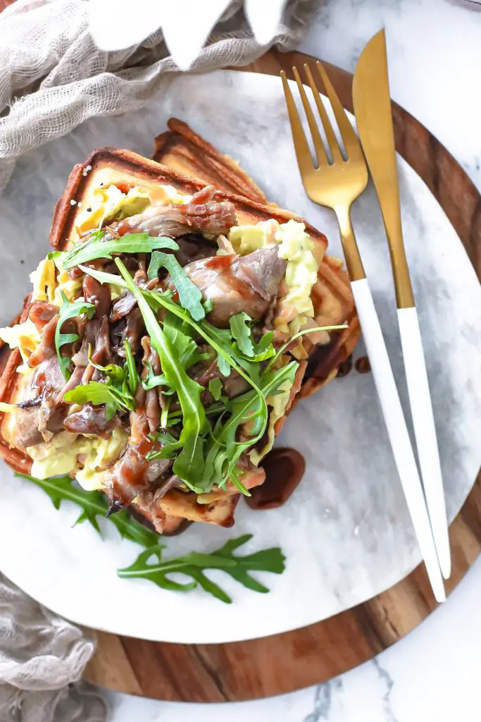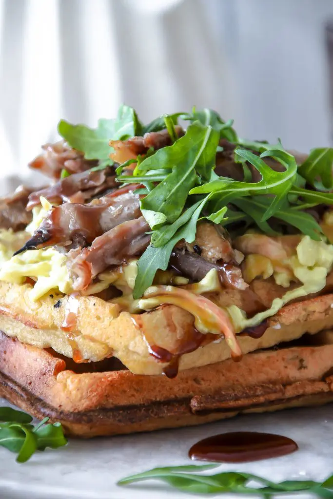4. Setjið svo á heita vöffluna hrásalat neðst, andalæri ofan á og dreifið svo heitri Hoisin/hlynsíróp sósunni yfir lærin og toppið með klettasalati