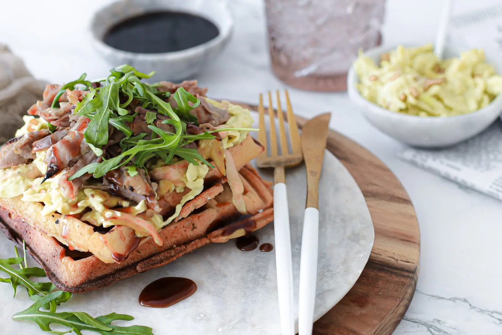 4. Setjið svo á heita vöffluna hrásalat neðst, andalæri ofan á og dreifið svo heitri Hoisin/hlynsíróp sósunni yfir lærin og toppið með klettasalati