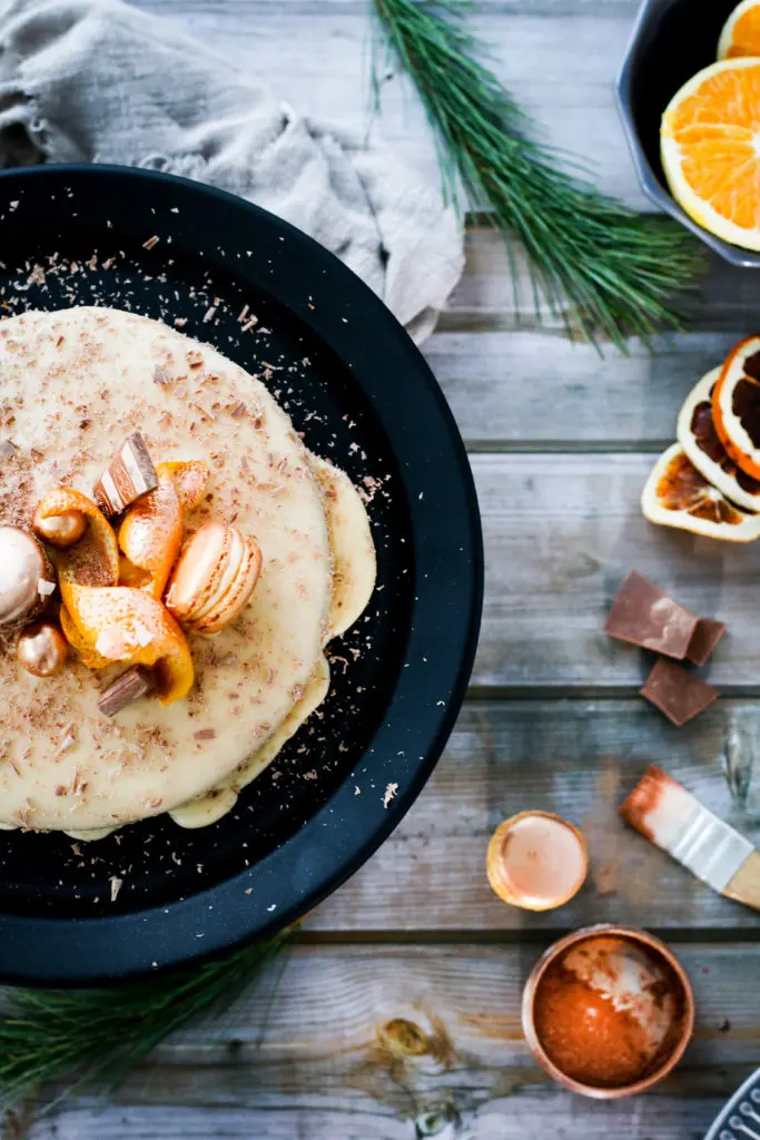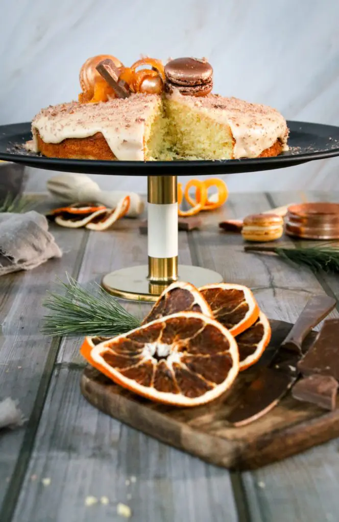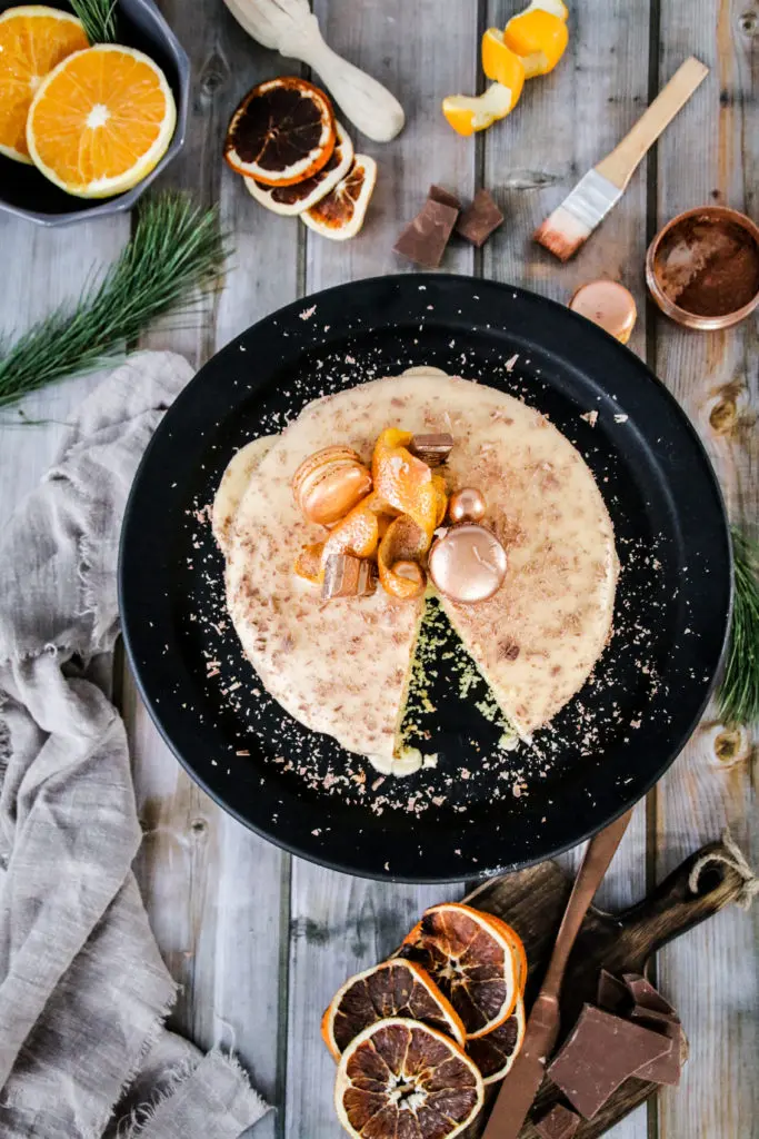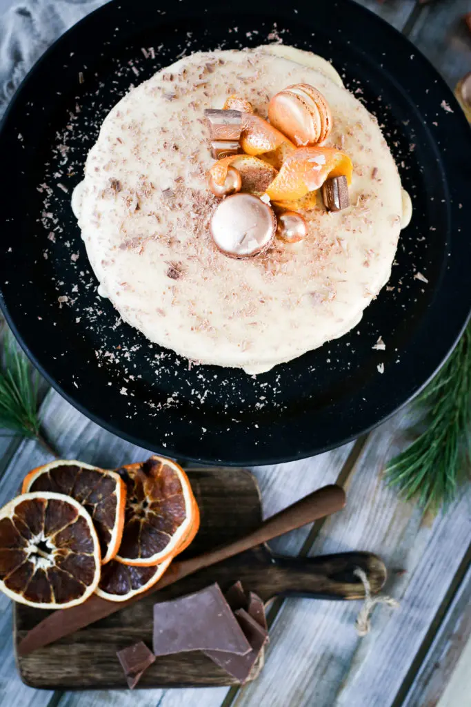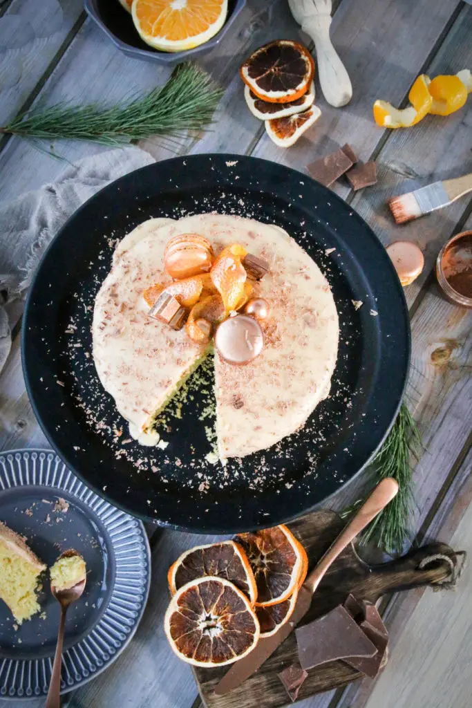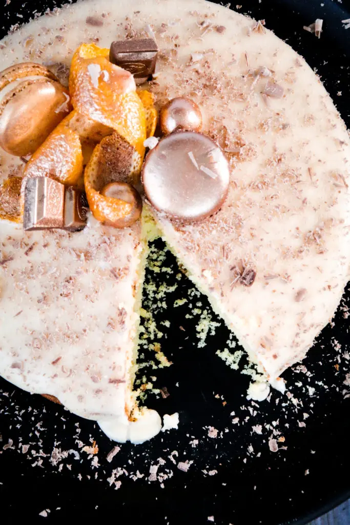 - Þegar kremið er komið á kökuna, raspið þá appelsínusúkkulaði yfir hana