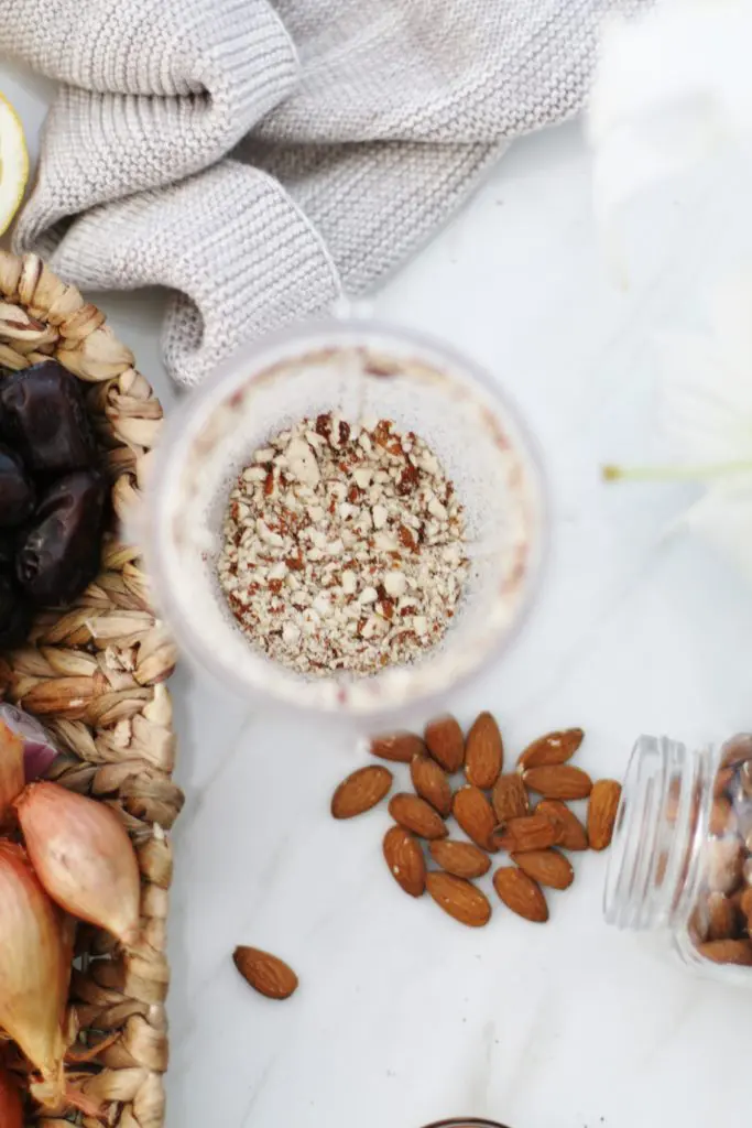 - Kælið möndlurnar í pínu stund og setjið í kvörn eða blandara og malið í grófan mulning og setjið til hliðar á disk.