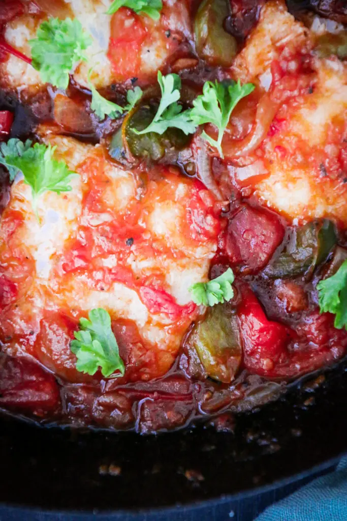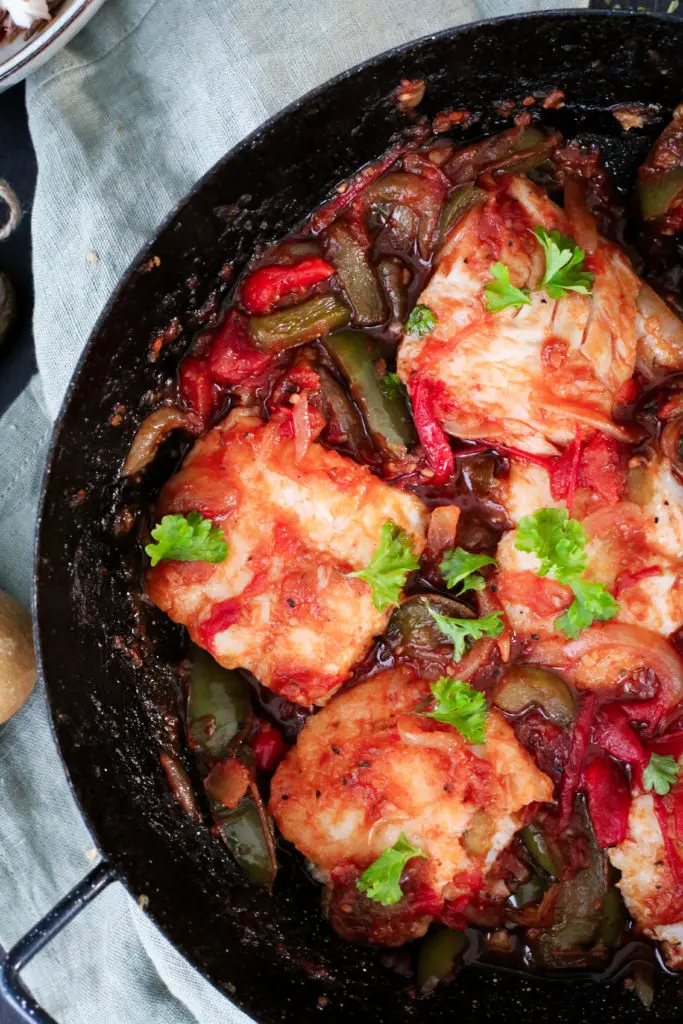 Réttinn er ekki flókið að gera en hann þarf smá tíma til að verða til. Tímafrekast við hann er að ná lauk og paprikum mjúkum áður en öllu er blandað saman með saltfiskinum.