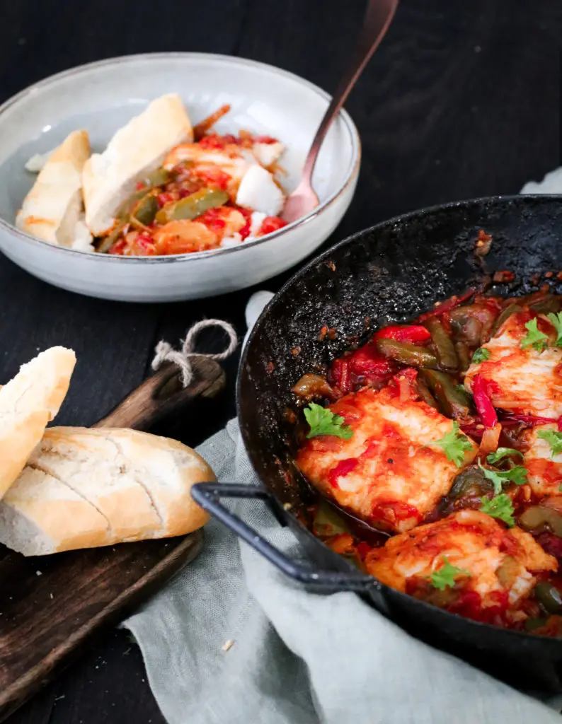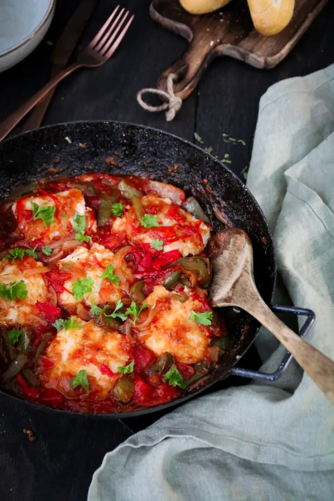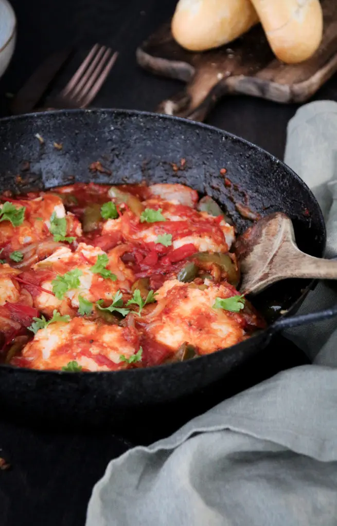 Best er að bera þennan rétt fram með góðu nýbökuðu snittubrauði og grænum ólífum með. Hér þarf að passa vel að fiskurinn nái að halda lögun sinni en verði ekki að plokkfisk ofan í sósunni, því er mikilvægt að hræra ekkert í réttinum eftir að fiskurinn er kominn út á, bara rétt setja smá sósu yfir bitana og leyfa þeim að hitna ofan í sósunni. Ef þið eruð ekki fyrir saltfisk má nota ýsu í staðinn eða jafnvel kjúkling.