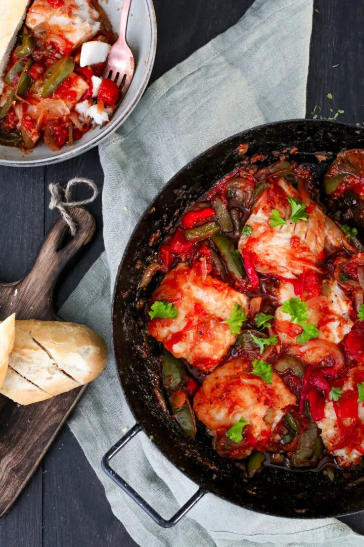 Best er að bera þennan rétt fram með góðu nýbökuðu snittubrauði og grænum ólífum með. Hér þarf að passa vel að fiskurinn nái að halda lögun sinni en verði ekki að plokkfisk ofan í sósunni, því er mikilvægt að hræra ekkert í réttinum eftir að fiskurinn er kominn út á, bara rétt setja smá sósu yfir bitana og leyfa þeim að hitna ofan í sósunni. Ef þið eruð ekki fyrir saltfisk má nota ýsu í staðinn eða jafnvel kjúkling.