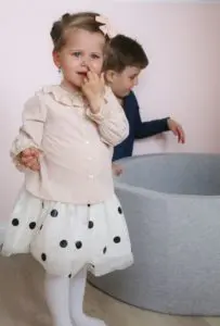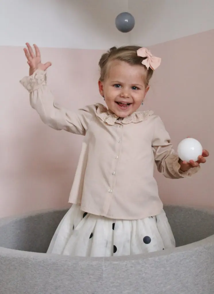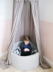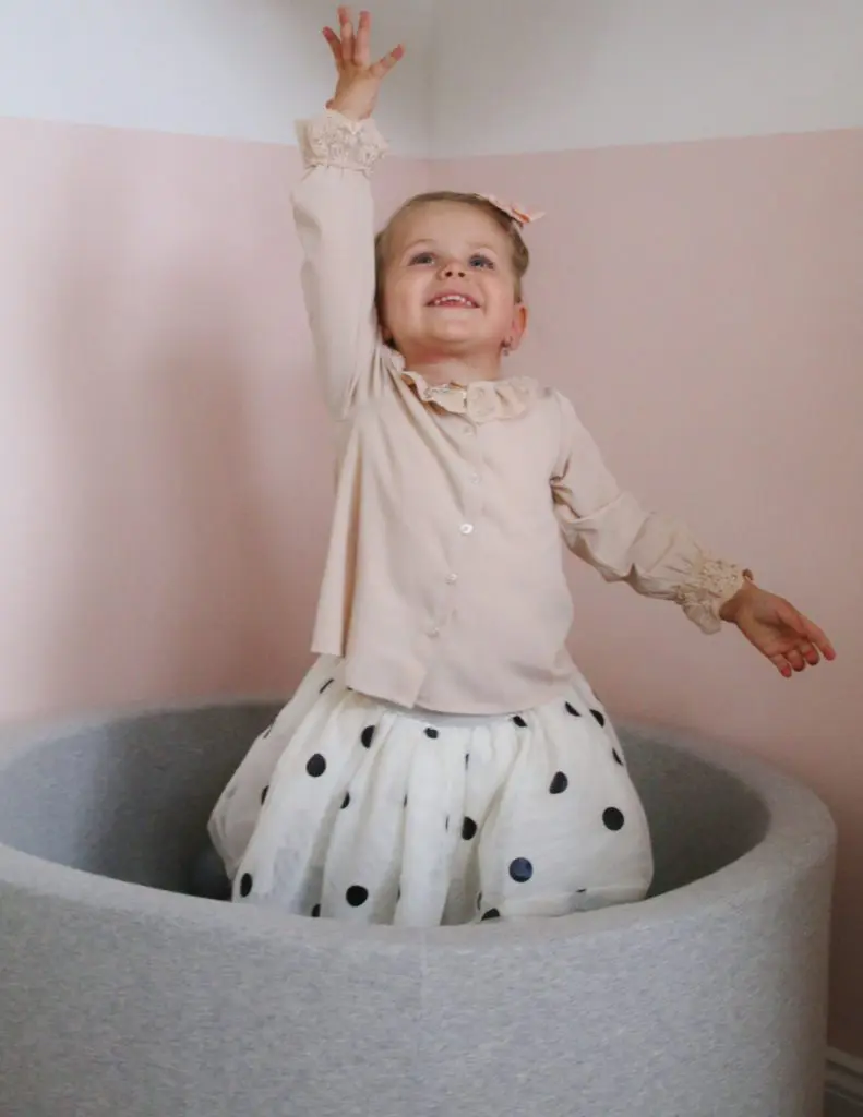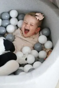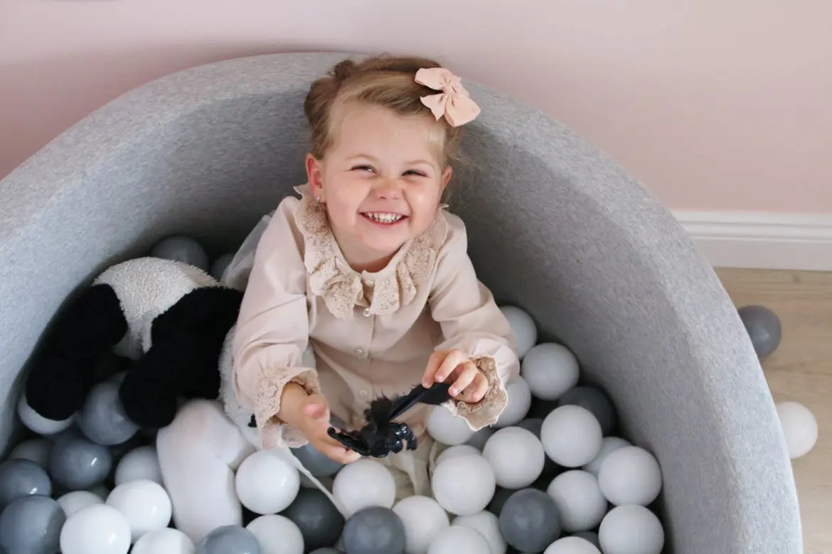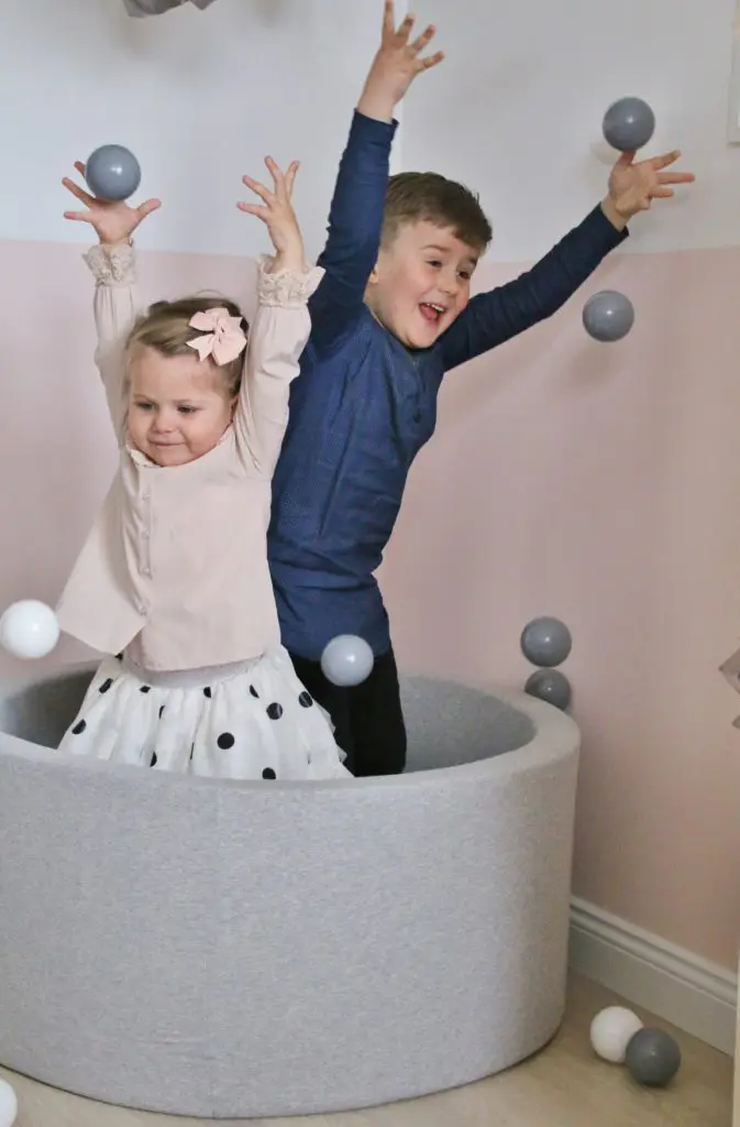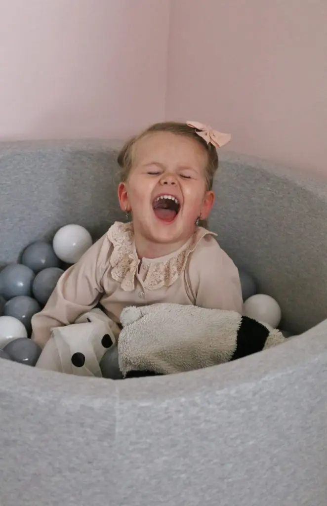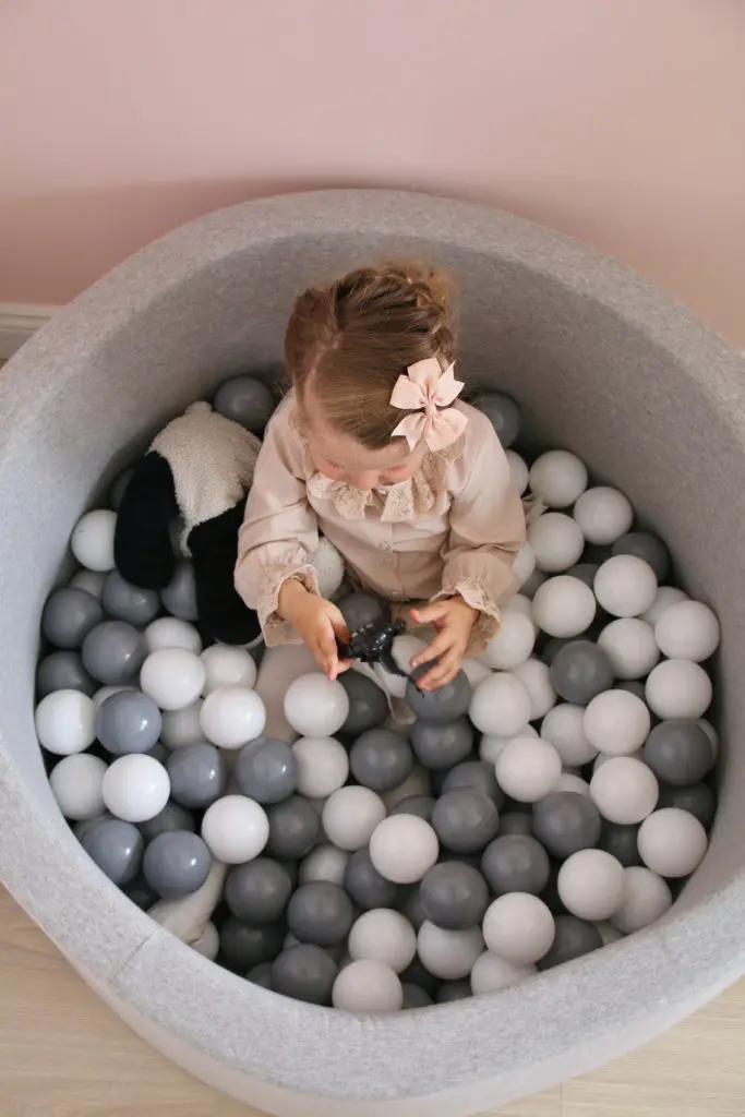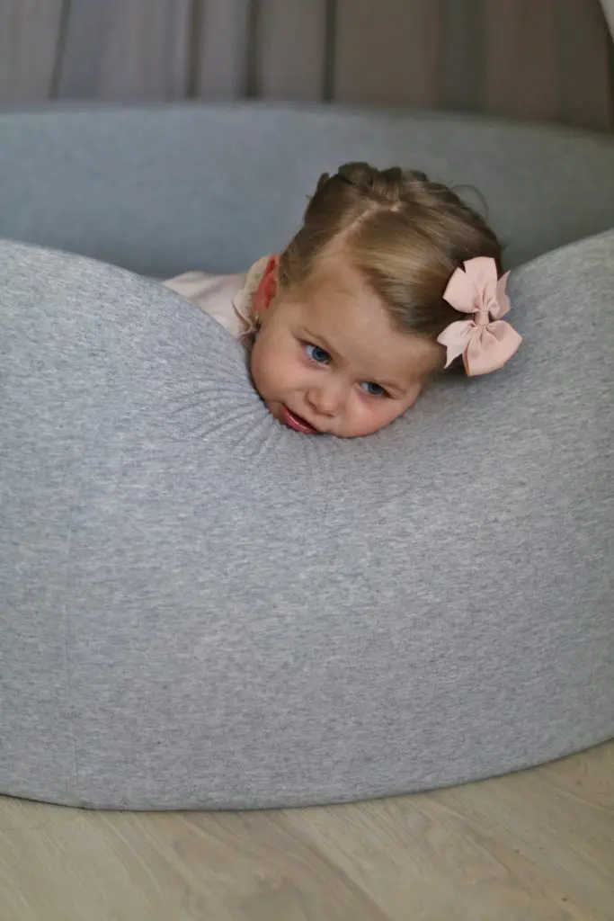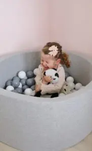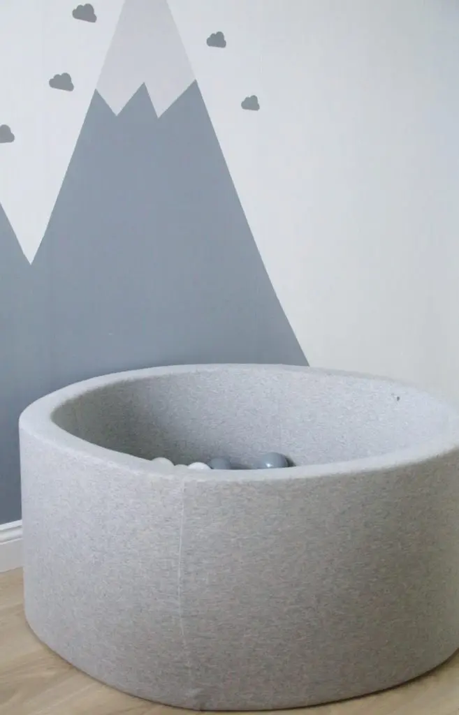 Það sem er svo gott við boltana er að þeir halda alveg lögun sinni þrátt fyrir að vera mjúkir og kremjast ekki saman. Þeir koma í gráu og hvítu en gryfjuna er hægt að fá í bæði gráu og bleiku. Sú bleika er ofboðslega falleg líka, en þar sem ég ákvað að mála herbergið ferskjubleikt fannst mér þessi gráa passa betur inn til Ölbu.