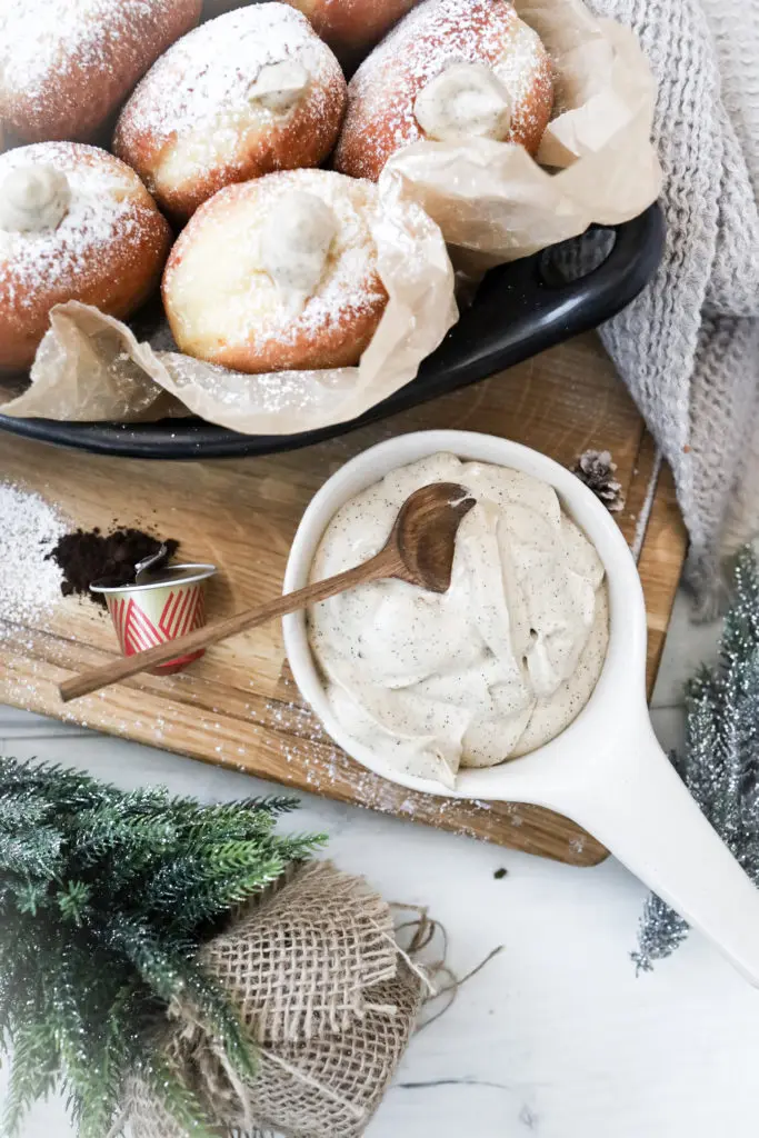 Oftast fyllt með vanillukremi eða annars konar kremi. Ég ákvað að gera milt og gott silkimjúkt kaffikrem inn í.