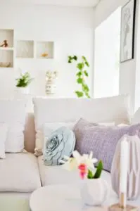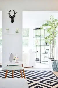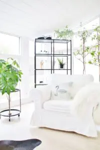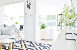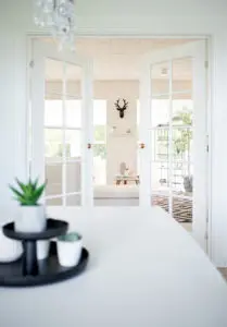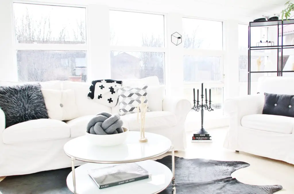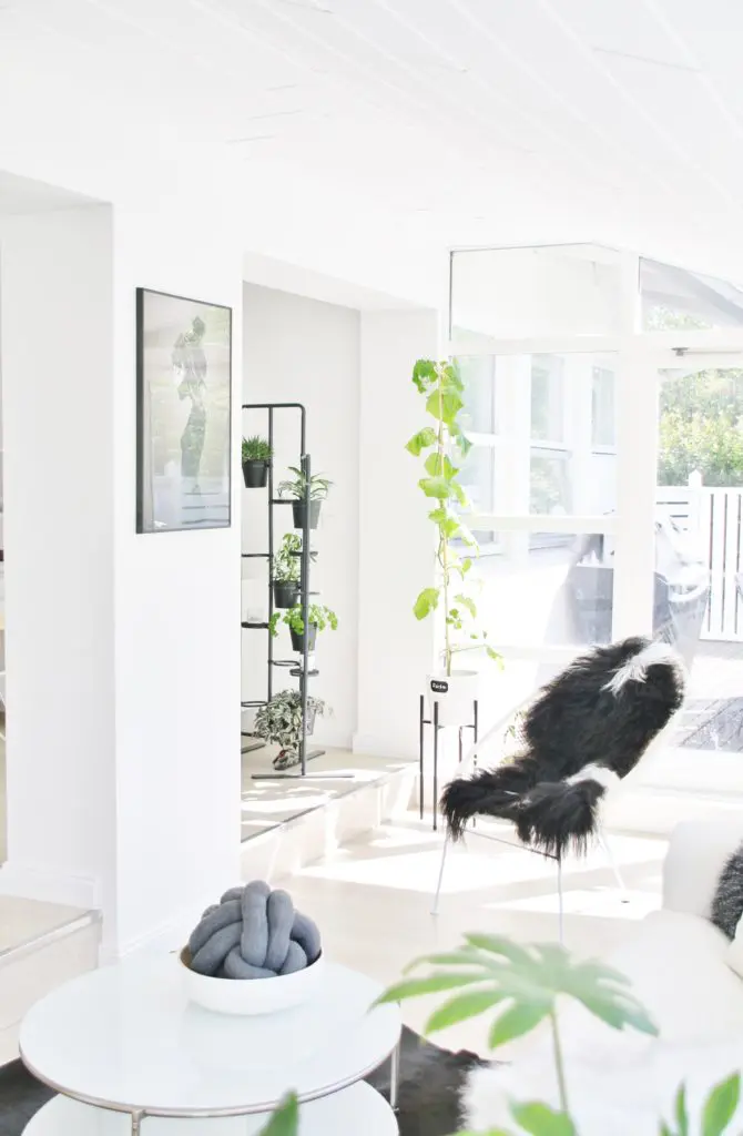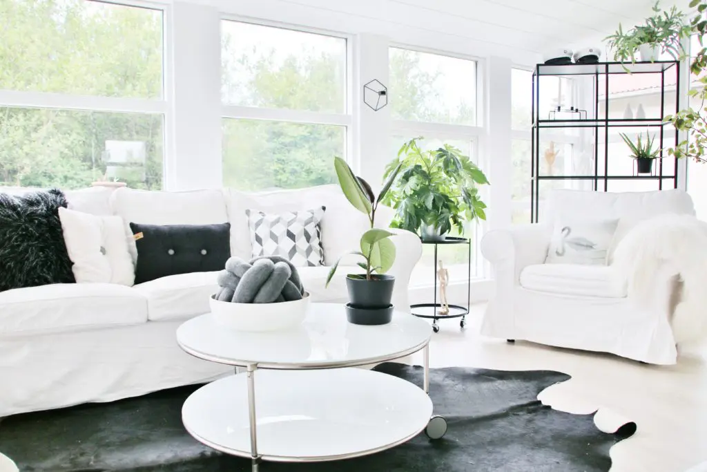 Eftir miklar pælingar ákváðum við að taka niður alla veggi sem lokuðu stofunni af og loka hurðaropinu inn í eitt herbergið sem lá frá stofunni og færa það í forstofuna. Með því græddum við veggjapláss og einhvernveginn bara stækkaði stofan og varð heillegri við það. Allt birti líka alveg ótrúlega upp við að opna svona rýmin og mála allt skjannahvítt. Í dag þá truflar það mig ekki vitund að gluggarnir séu niðri í sólstofunni og finnst mér vera nóg af gluggum hér á húsinu. Við stækkuðum einnig hurðaropið inn í eldhús og settum tvöfalda franska glerhurð. Við það finnst mér eins og við höfum grætt glugga, en það eru 4 eldhúsgluggar sem sést mikið í frá sjónvarpsholi.
