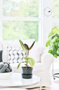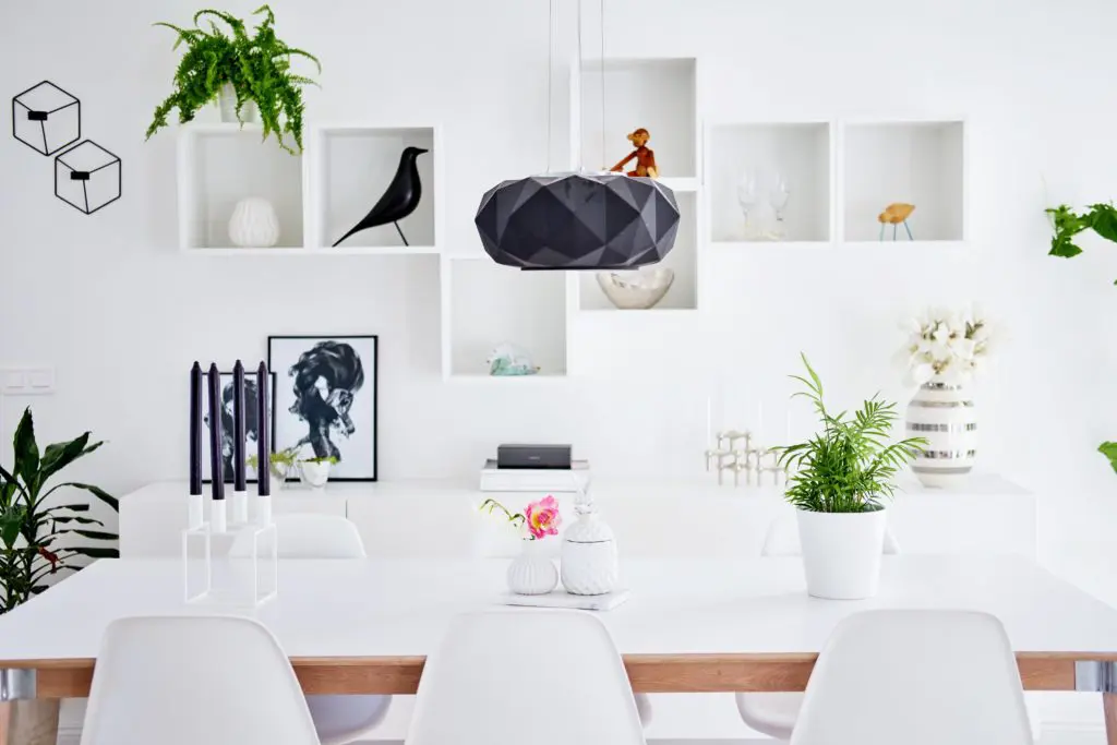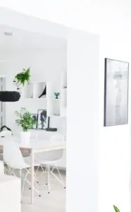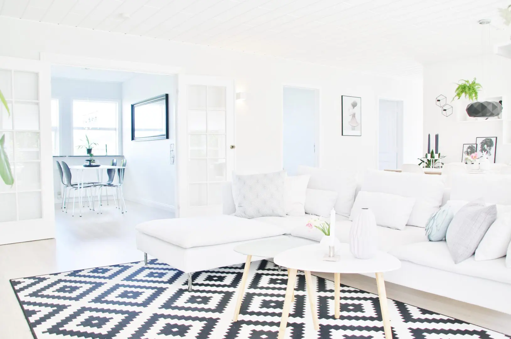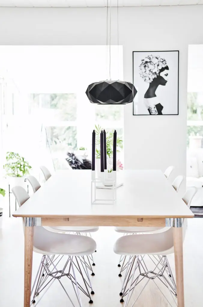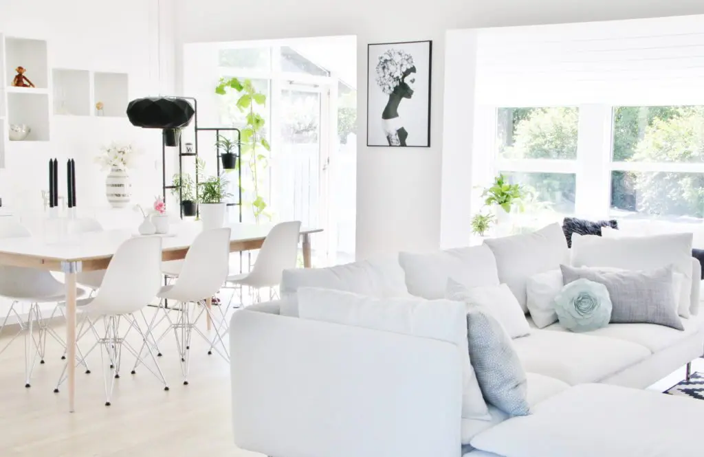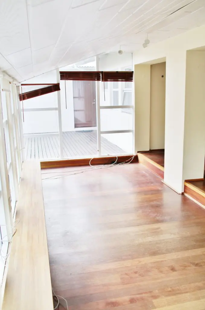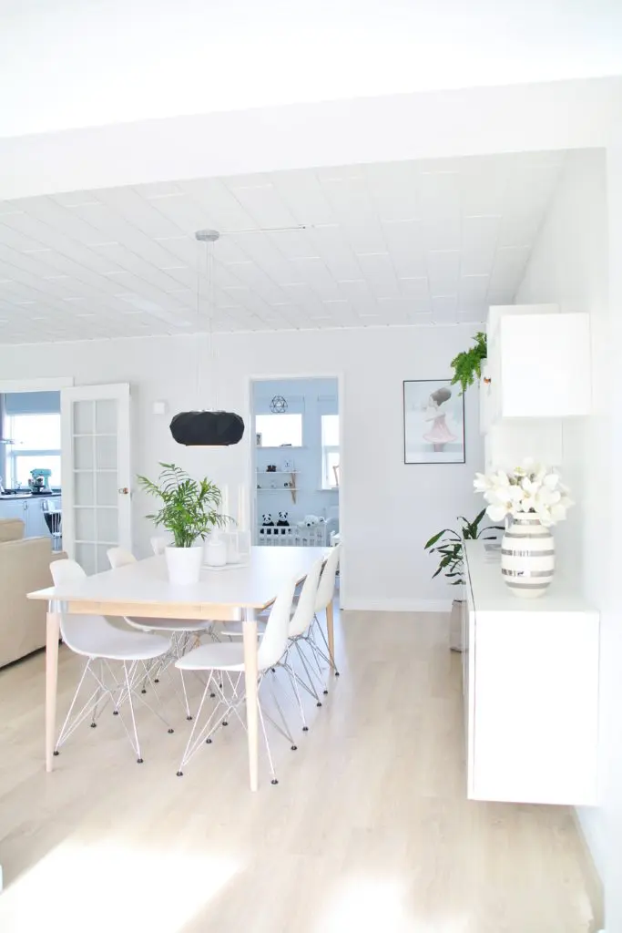 Upprunalega langaði mig til að taka niður þessa tvo mjóu veggjastólpa sem þið sjáið á myndinni fyrir ofan og hafa stofu, borðstofu og sólstofu sem eitt flæðandi rými. Það var hægt en hefði kostað mikla og dýra vinnu þar sem þetta eru burðarstólpar og hefðum við þurft að láta reikna fyrir okkur burðarvirknina  á verkfræðistofu og setja járnstólpa í loftið í staðin. Við ákváðum því bara að halda þeim og í dag sé ég alls ekki eftir því þar sem að þeir skipta rýminu upp og hægt er að hengja upp myndir á þá.