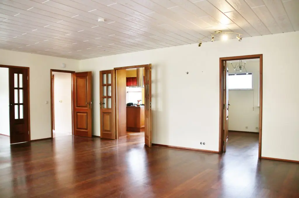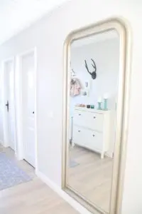 Panilinn sprautuðum við skjannahvítan en seinna ætla ég að skrifa færslu um hvað er mikilvægt að huga að þegar panill er sprautaður. Við lögðum svo nýtt gólfefni sem er á öllu húsinu nema baðherbergjum og þvottahúsi og settum nýja gólflista. Hér getið þið séð allt um gólfefnin og listana á húsinu.