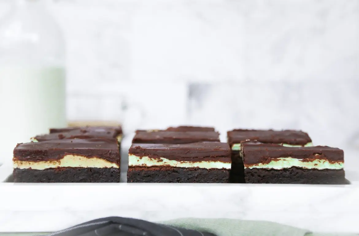 Oft myndast svona þurrt upphleypt efsta lag á Brownies sem brotnar auðveldlega af. Best er að taka allt þannig af efsta lagi kökunnar áður en kremið er sett á. Geymið kökuna í kæli og ef það er afgangur sem þið viljið geyma er gott að setja hana í frystir en uppkriftin er frekar stór. Þegar þið gerið myntukremið er best að leyfa því að standa í pínu stund svo það sé búið að þykkna aðeins og leki ekki um allt. Ef kremið er frekar þykkt og stíft setjið það þá strax og það er til á kökuna því það stífnar svo meira. Þetta getur verið misjafnt eftir því hvernig soðna sykurvatnið kemur út.