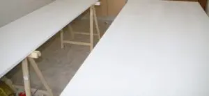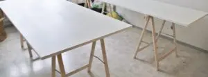 Það fyrsta sem þarf að gera er að setja MDF plöturnar á búkka og grunna þær svo, og mála yfir með hvítu.