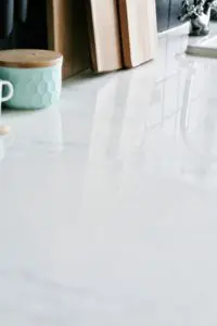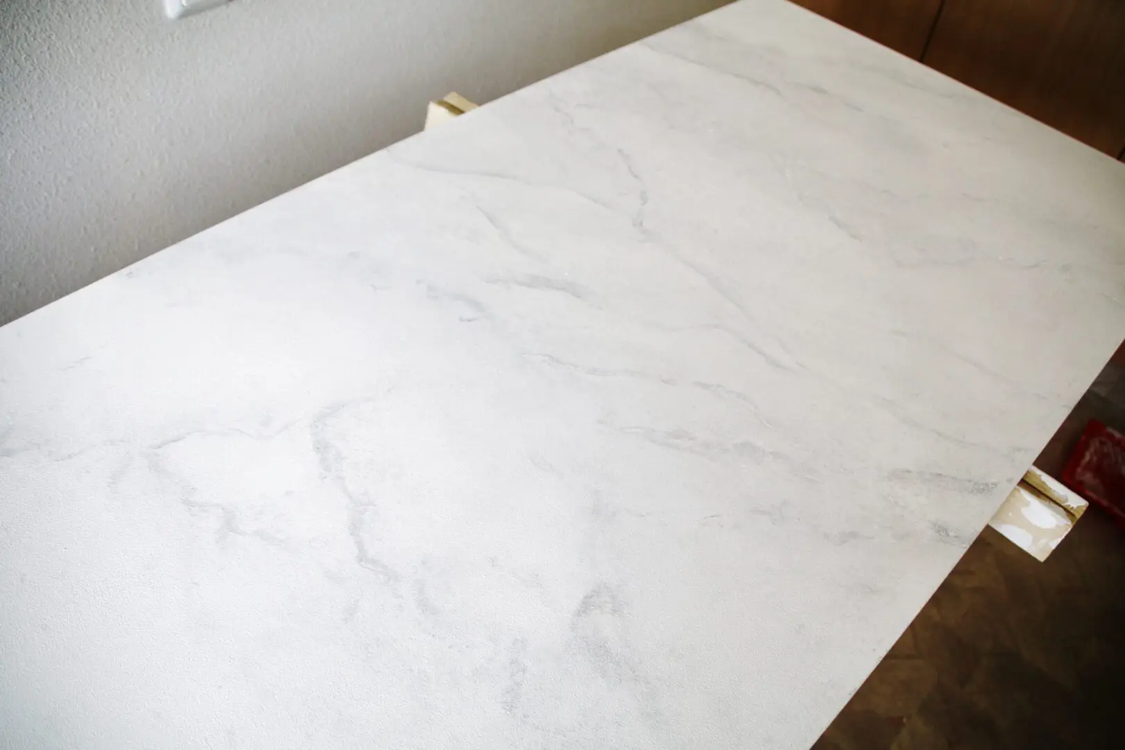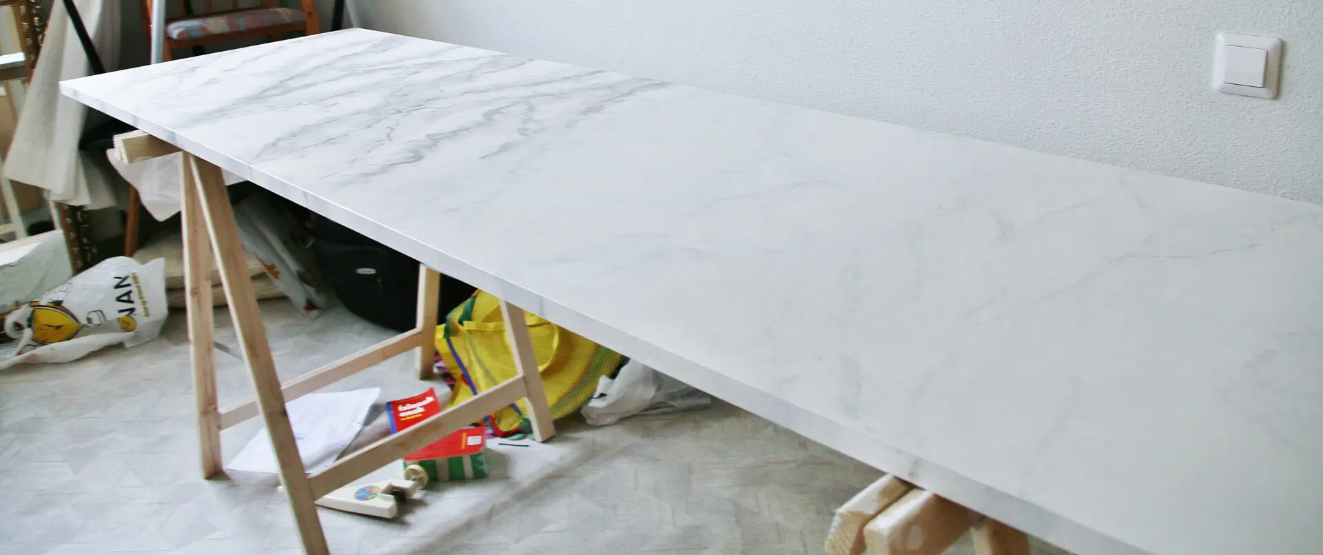 Af einni umferð af tveggja þátta Epoxy lakki kemur þykkt lag eins og ef um 60 umferðir af venjulegu lakki væri að ræða. Einnig er efnið gífurlega sterkt og þolir það bæði högg og mikinn hita. Því gerir það borðplöturnar mjög sterkar. Epoxy lakkið er einnig alveg glært og þess vegna kaus ég að nota það yfir marmaramynstrið þar sem önnur venjuleg lökk eru alltaf gultóna, og það vildi ég alls ekki á borðplötunar.
