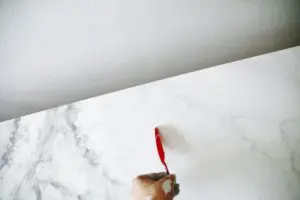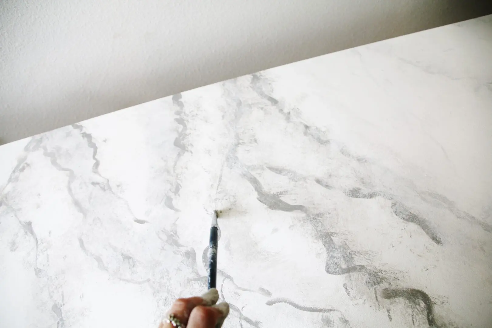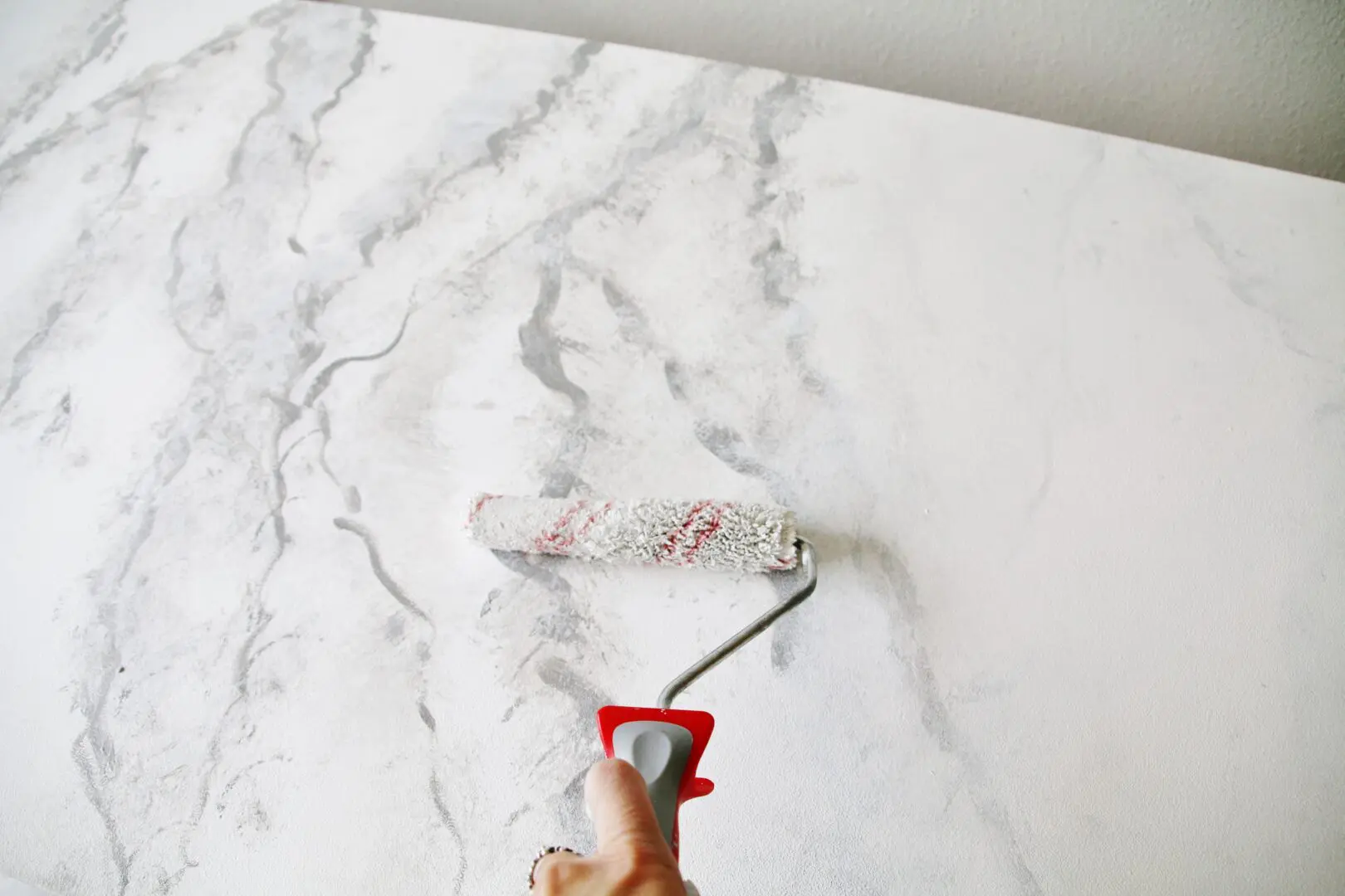 Þegar þessu er lokið mála ég aftur létt yfir með rúlluni og set smá hvítt í hana. Mikilvægt er að láta þessa umferð af svömpuninni og æðamynduninni samt þorna fyrst áður en rúllað er yfir til að platan verði ekki grá á litinn. Það er að segja ef þið viljið hafa plötuna hvíta í grunninn með gráum æðum. Ef þið viljið hafa hana gráa þá er betra að mála strax yfir æðarnar.