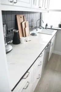 Þið sem hafið lesið færsluna um breytingarnar á eldhúsinu mínu sáuð að ég gerði borðplöturnar sjálf. Við tókum eldhúsið okkar í gegn fyrir 150.000 kr og hefðu nýjar borðplötur léttilega geta farið upp í þá upphæð. Þar sem við ætlum að hafa eldhúsið svona í 2-3 ár meðan við söfnum fyrir nýju ákvað ég að gera borðplöturnar sjálf, en ég er mjög hrifin af marmara. Ég tók mig því til og pinterestaði hvernig á að mála sjálfur plötur eins og marmara. Útkoman var vel ásættanleg og eru borðplöturnar níðsterkar. Og svo ég tali nú um hversu ódýrar þær voru, en þær kostuðu mig um 25.000 kr með öllu.