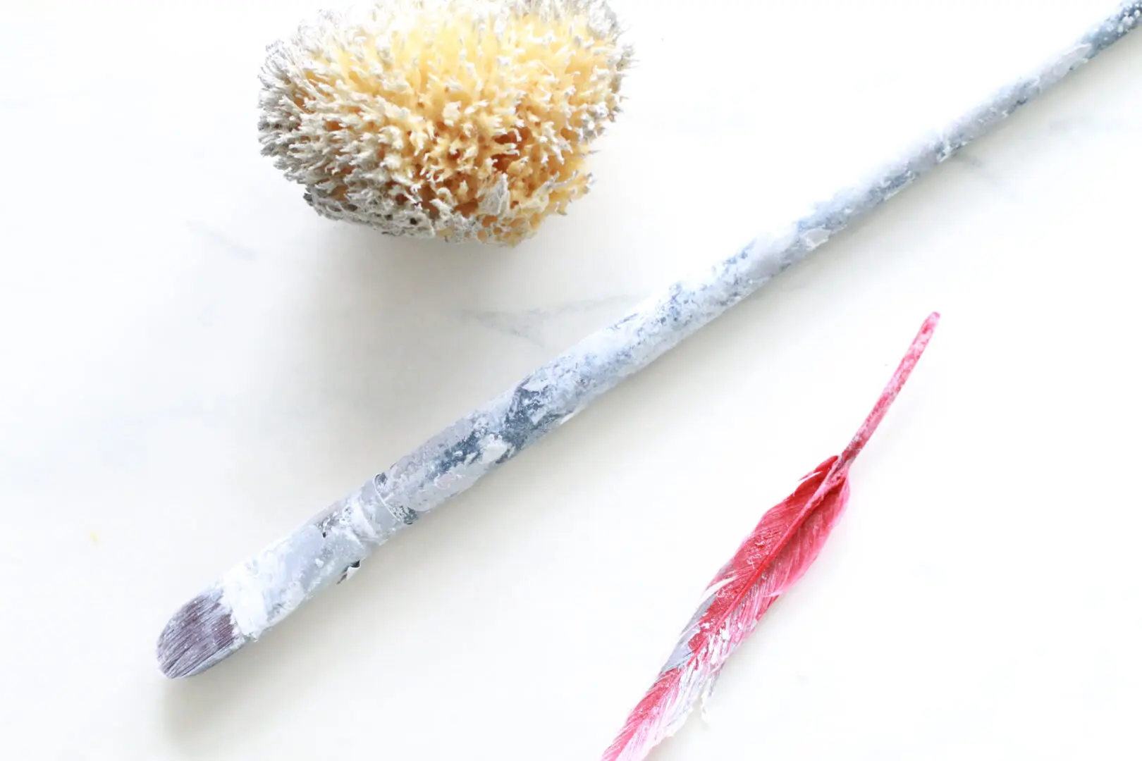 Þetta ferli er svo endurtekið eins oft og ykkur finnst þurfa. Ef þið viljið hafa mikið af æðum er betra að gera þetta nokkrum sinnum. Þ.e. að svampa, taka út mynstur með penslum og fjöður og öllum þremur gráu tónunum, mála yfir með hvítu. Endurtakið þetta aftur og aftur þar til þið erum sátt með útkomuna.