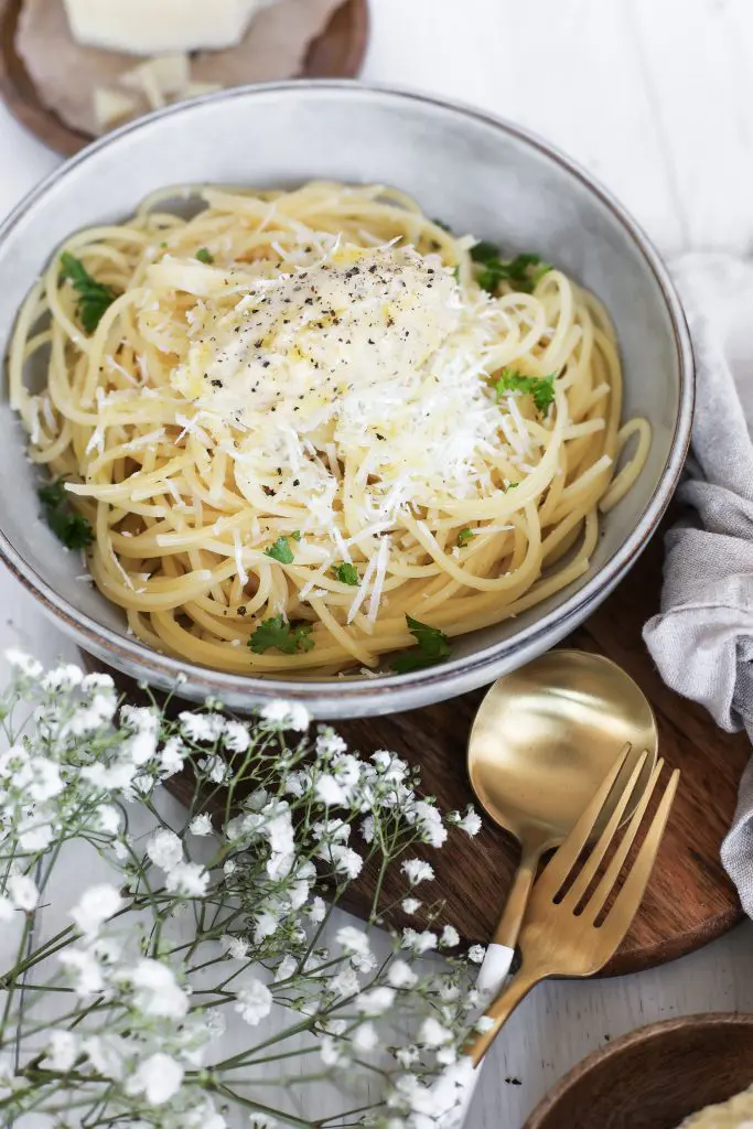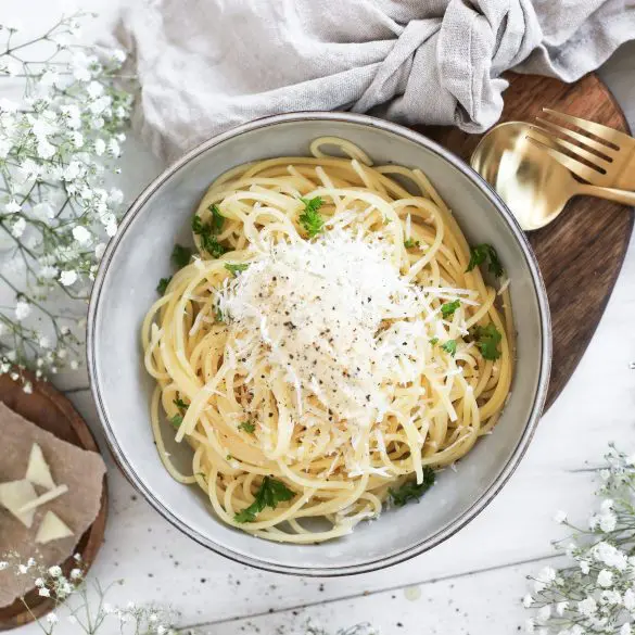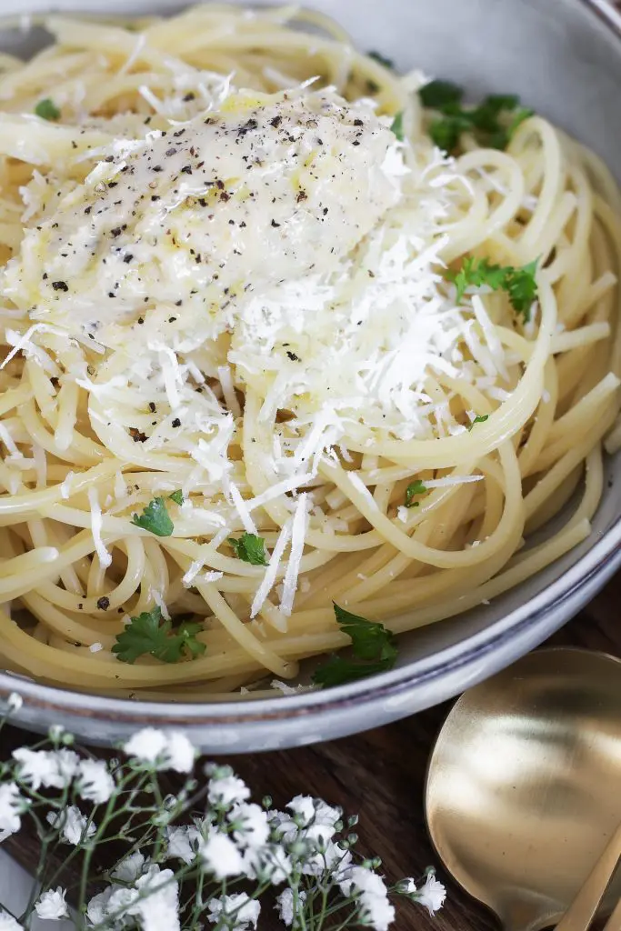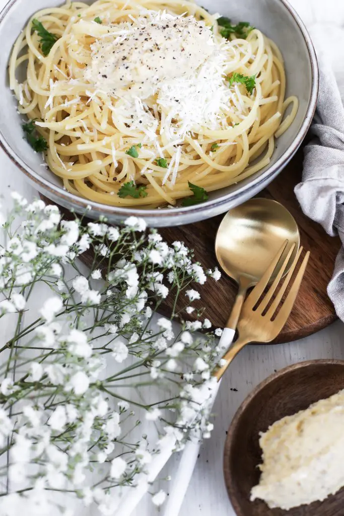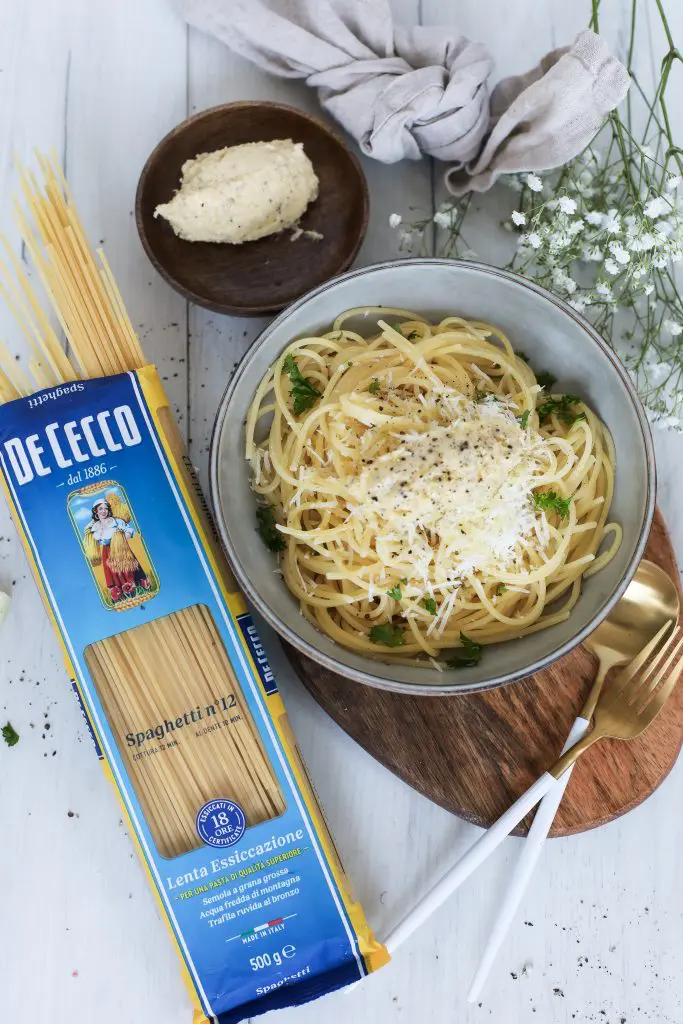 - Best er að bera fram spagettíið sjóðandi heitt og fá sér svo góða slettu af piparostasmjörinu út á og láta það bráðna yfir spagettíið, setja svo smá auka af ólifuolíu og enn meiri rifinn pecorino ost yfir
