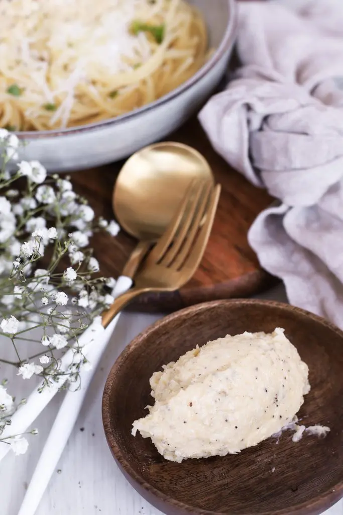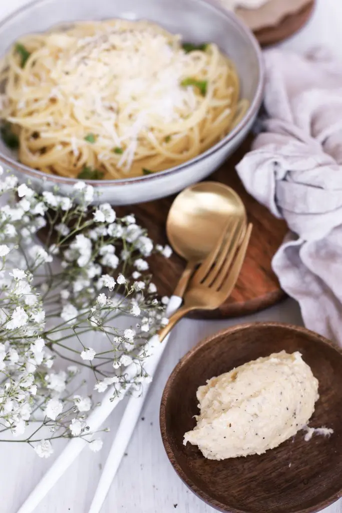 - Setjið smjörið í skál og setjið á borðið ásamt sjóðandi heitu spagettí