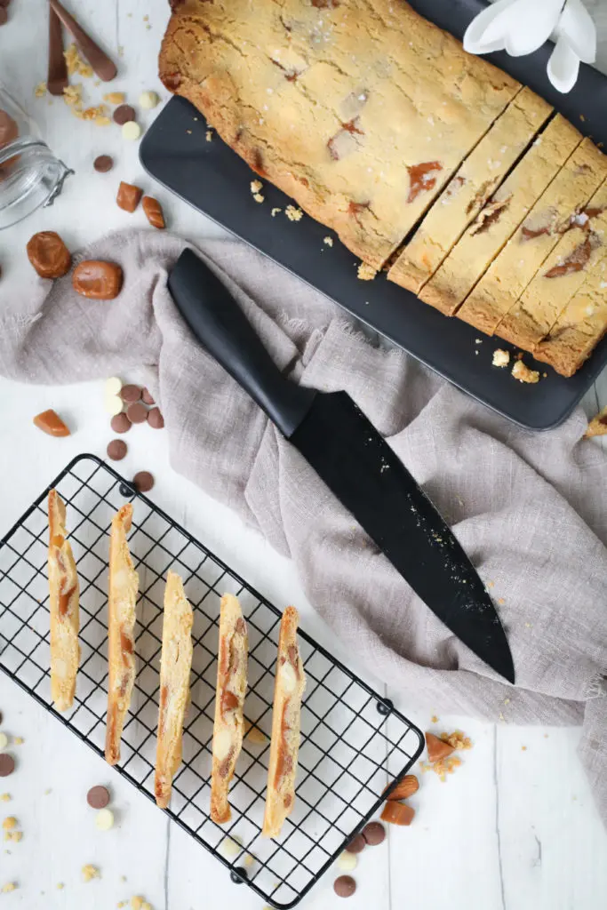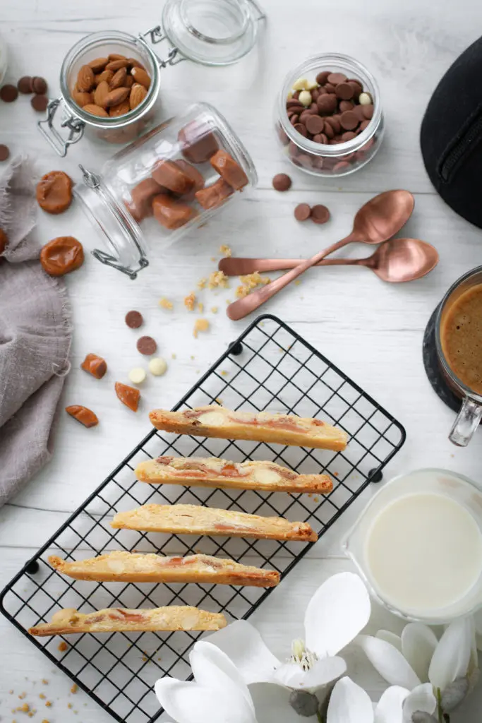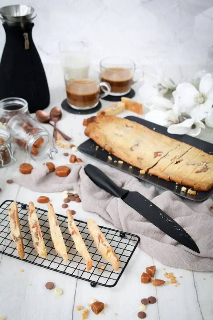 - Skerið karamellur niður í 4 bita hverja karamellu og bætið út í deigið ásamt súkkulaðidropum og heilum möndlunum