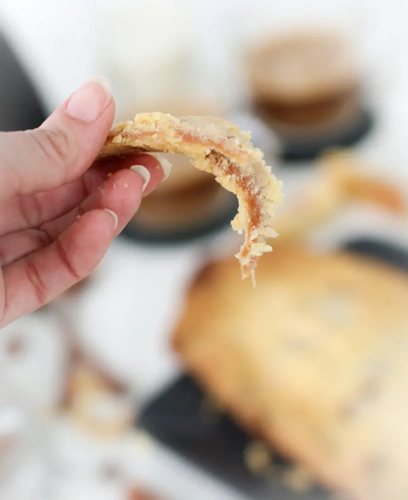 Þetta er mjög einfalt að gera en passið að rúlla deiginu upp í eins og þykka rúllu/bjúgu áður en það fer í ofninn og setja það þannig inn. Það á alls ekki að fara flatt eins og það lítur út inn í ofninn því það lekur út og verður flatt við bakstur. Það má frysta afgang og eiga til í frysti þegar gesti ber að garði en gott er að taka þá út eins og 10 mín áður.
