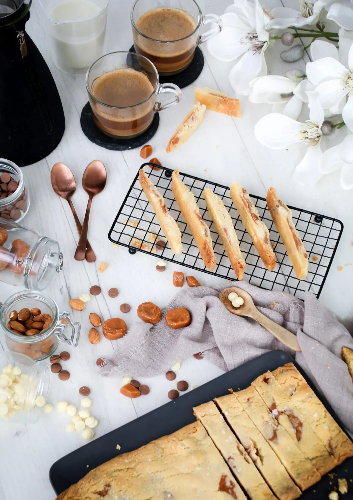- Skerið karamellur niður í 4 bita hverja karamellu og bætið út í deigið ásamt súkkulaðidropum og heilum möndlunum