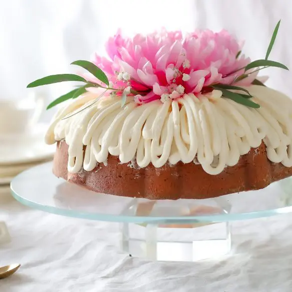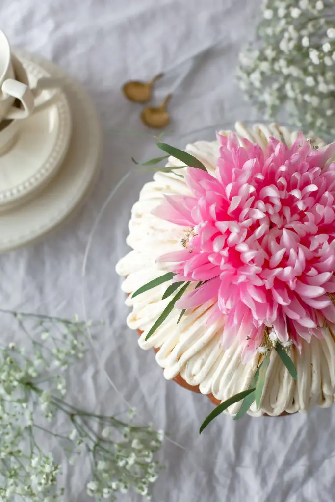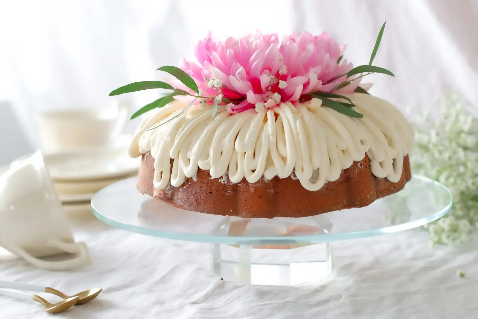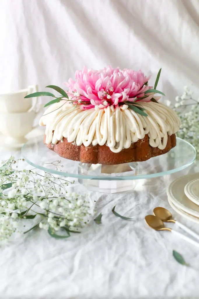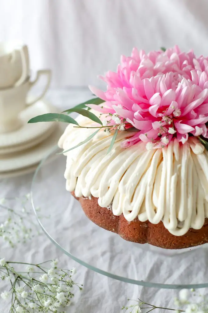 Bakaríið heitir Nothing but Bundt cake‘s, og ákvað ég að reyna leika svona köku eftir enda afar einfalt, bara henda í formköku og skreyta hana eins og þau gera með smjörkremi og fallegu blómi.