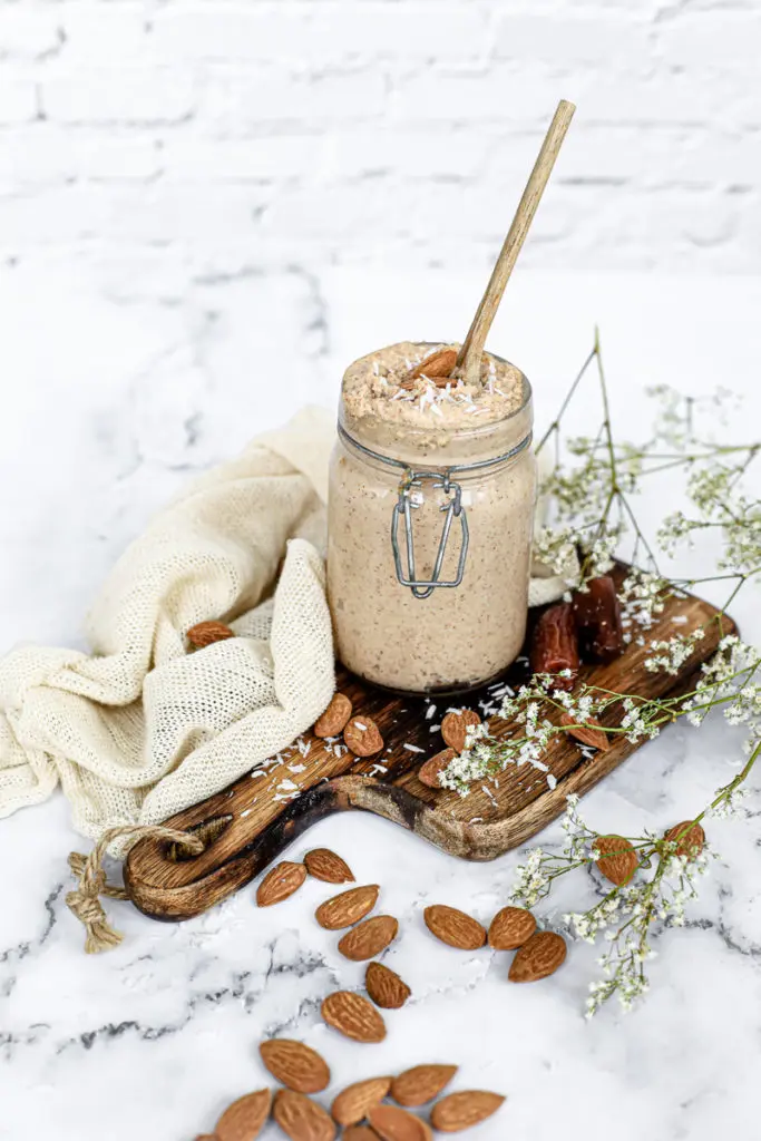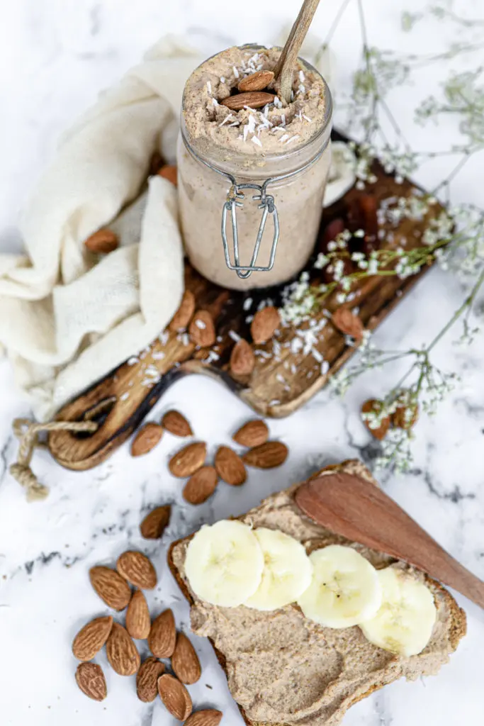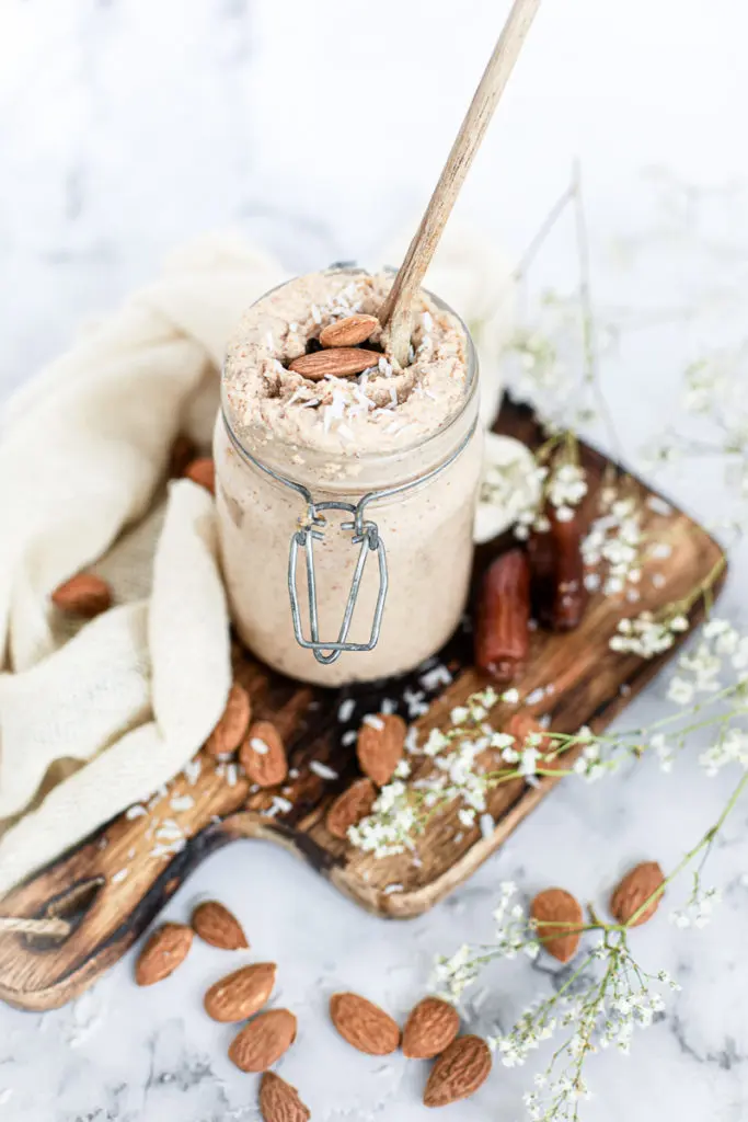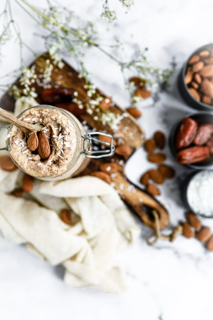Hér nota ég fá innihaldsefni og ég sæti smyrjuna með döðlum einum og sér sem gerir smyrjuna þéttari í sér og afar bragðgóða.