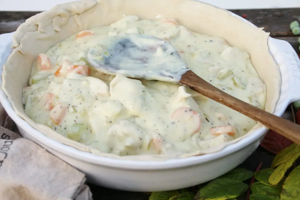- Bætið svo kjúklingnum, gulrótunum og selleríinu út á og hrærið saman. Slökkvið svo undir pottinum meðan deigið er flatt út
