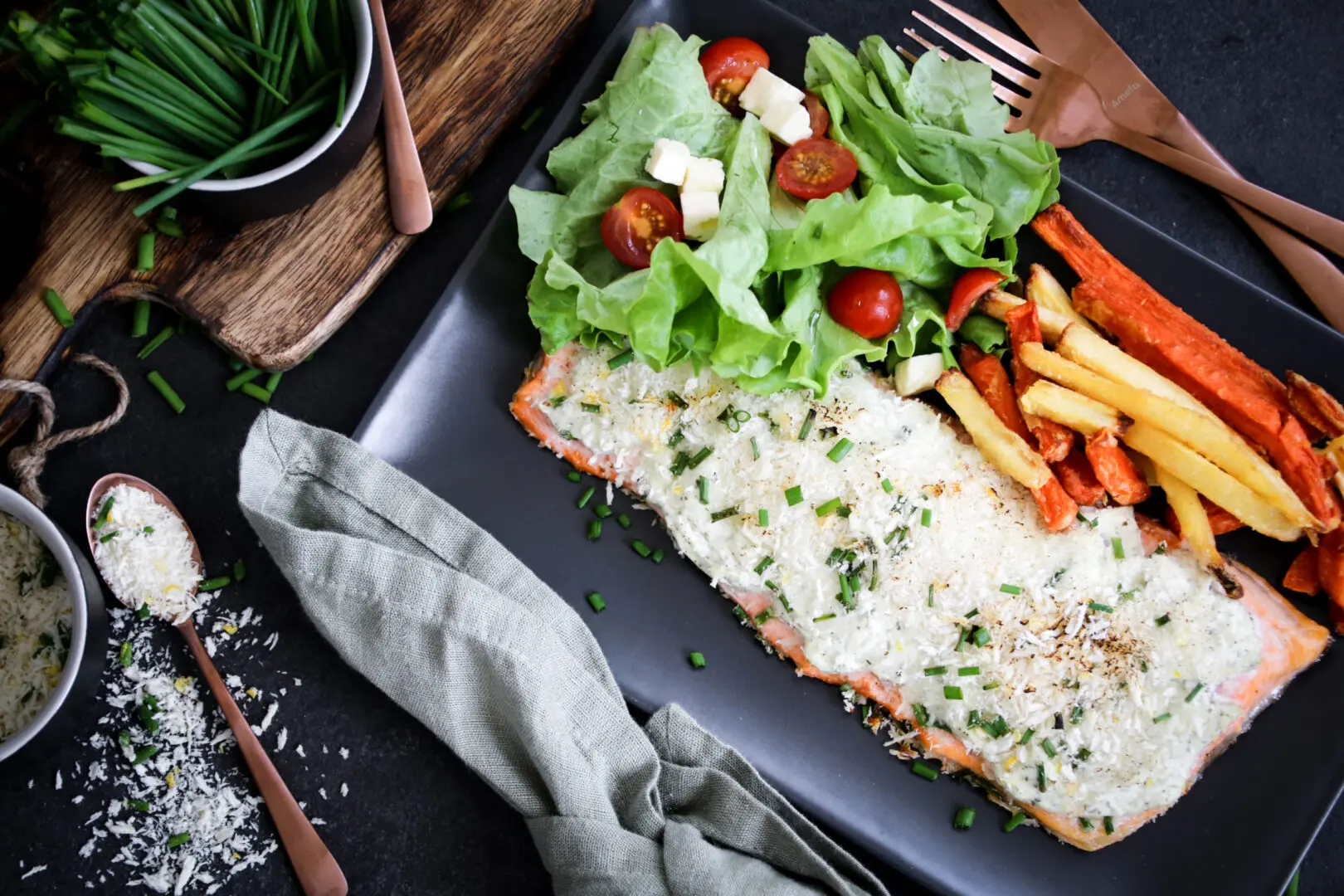 - Byrjið svo á að setja franskarnar inn í ofn meðan bleikjan og salat er útbúið því þær þurfa lengri tíma