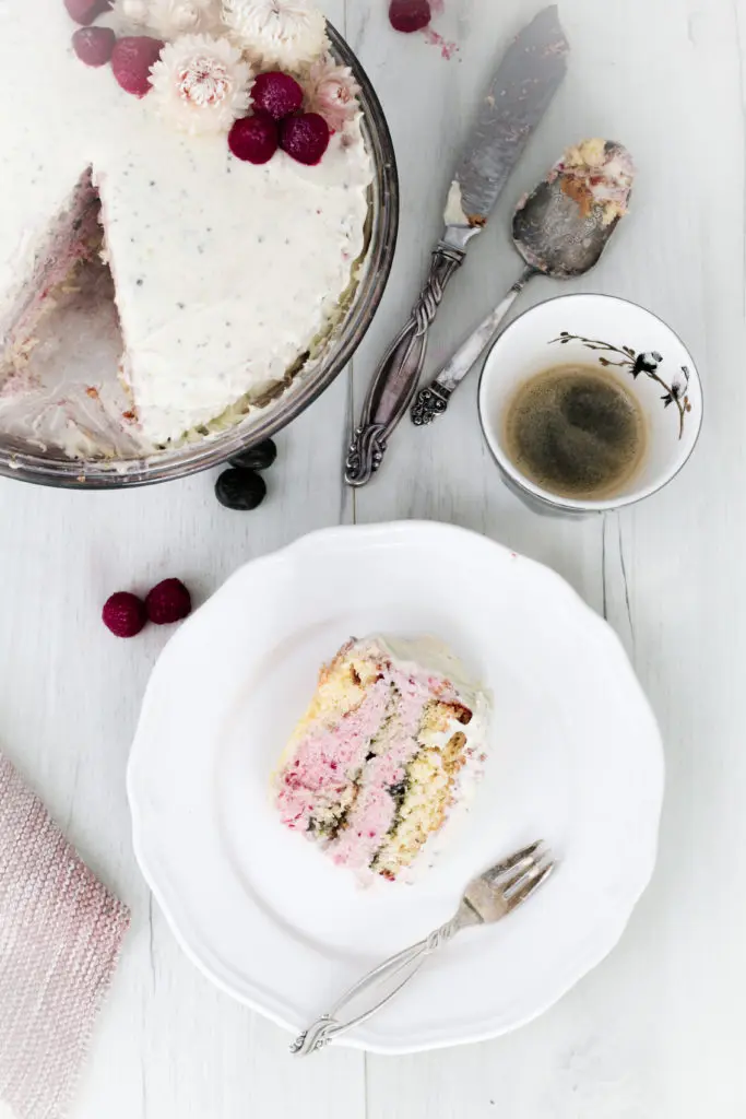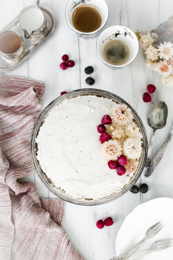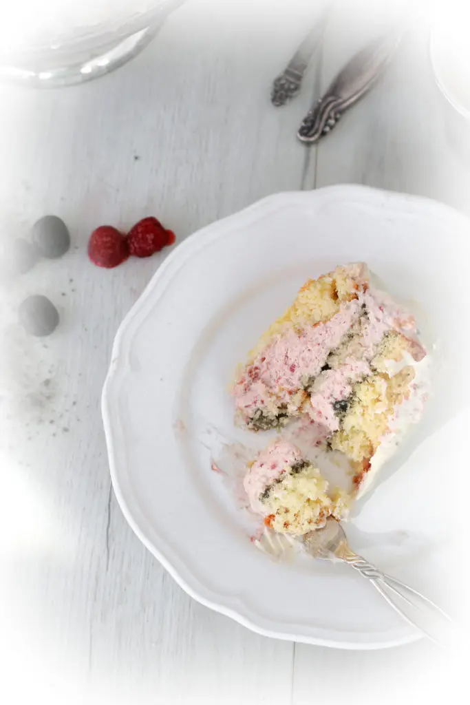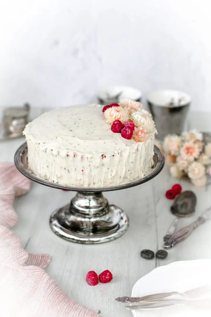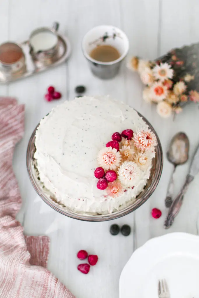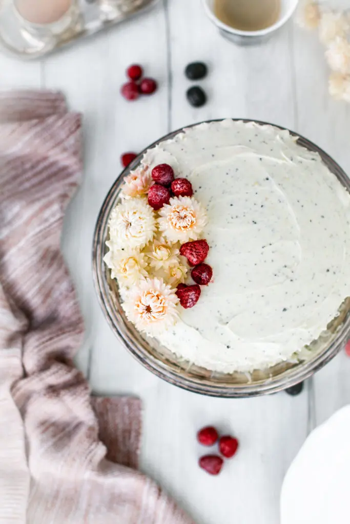 - Smyrjið svo mjúku kreminu yfir hliðar og topp kökunnar og skreytið ef þið viljið með ferskum hindberjum