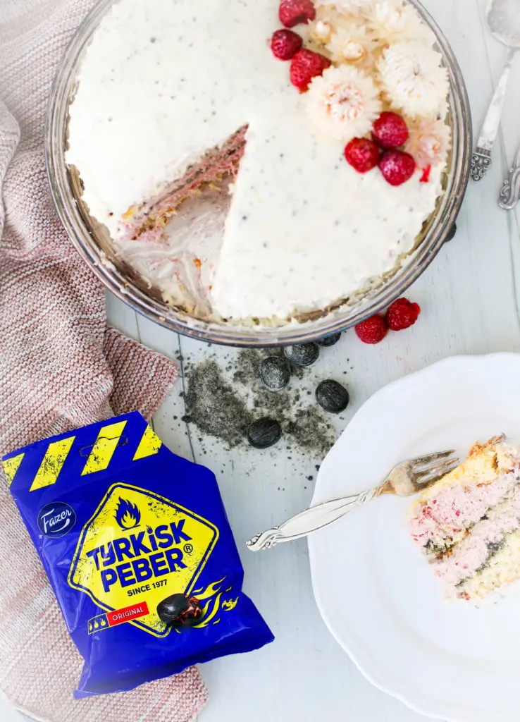 Fallegur bleikur hindberjarjóminn og svört piparbrjóstsykursrönd innan um fisléttan og fallega gula svampinn, úff ég fæ vatn í munninn.