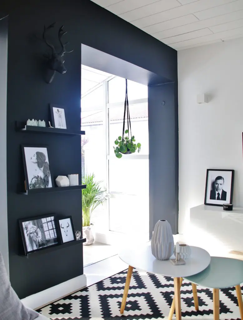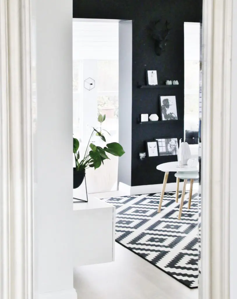 Það er óhætt að segja að okkur hafi vel tekist til með að gera rýmin hérna í húsinu sem björtust, og var ég mjög sátt. Ég var með einn svartan vegg í eldhúsi og annan inn í svefnherbergi og mér fannst það brjóta upp og ramma inn rýmin. Ég var búin að hugsa þetta fram og tilbaka hvort ég ætti að þora að mála stóra vegginn inn í stofunni svartan, þar til ég komst að þeirri niðurstöðu að ég gæti ekki ákveðið þetta endanlega fyrr en ég væri búin að prófa. Því varð úr að við ákváðum að láta vaða áður en ég myndi enn einu sinni guggna. Hentum við því upp svartri málningu eitt kvöldið í skyndi.