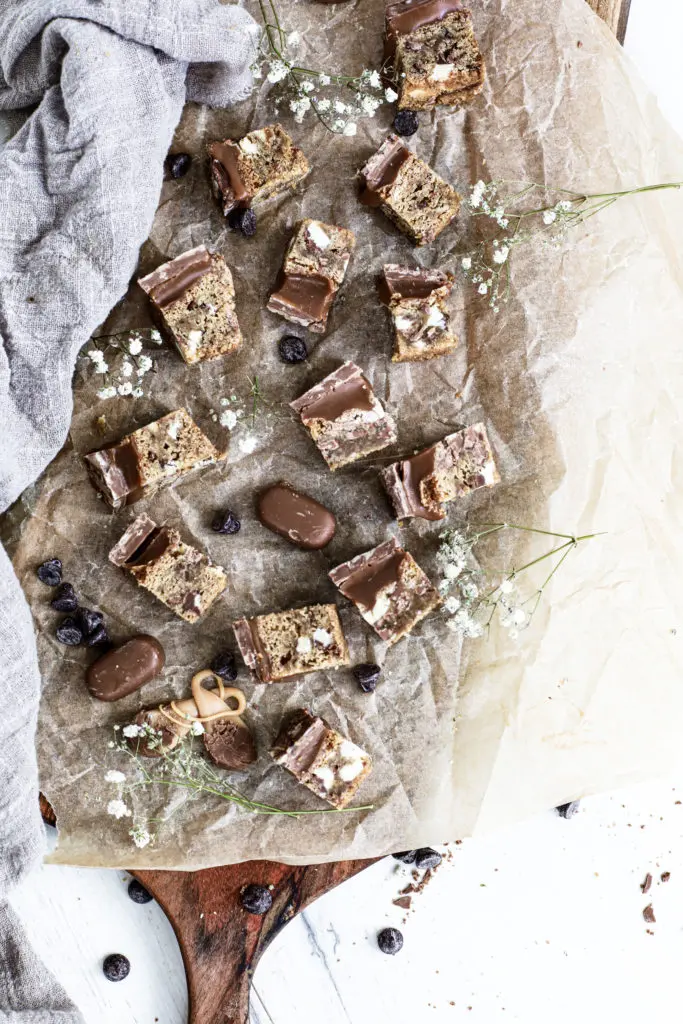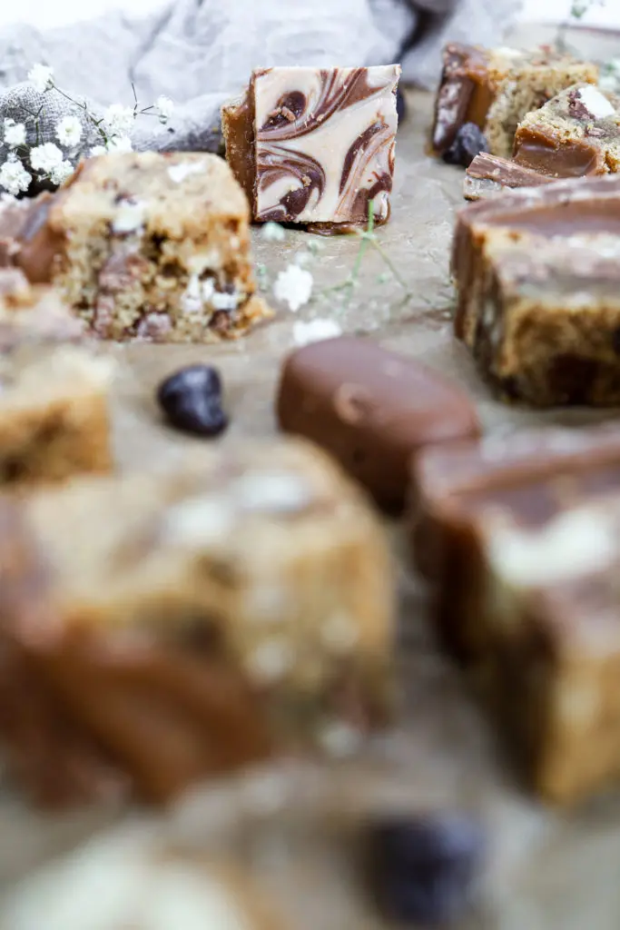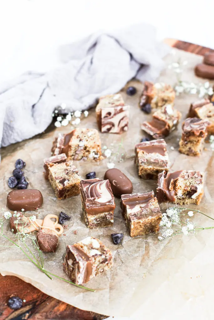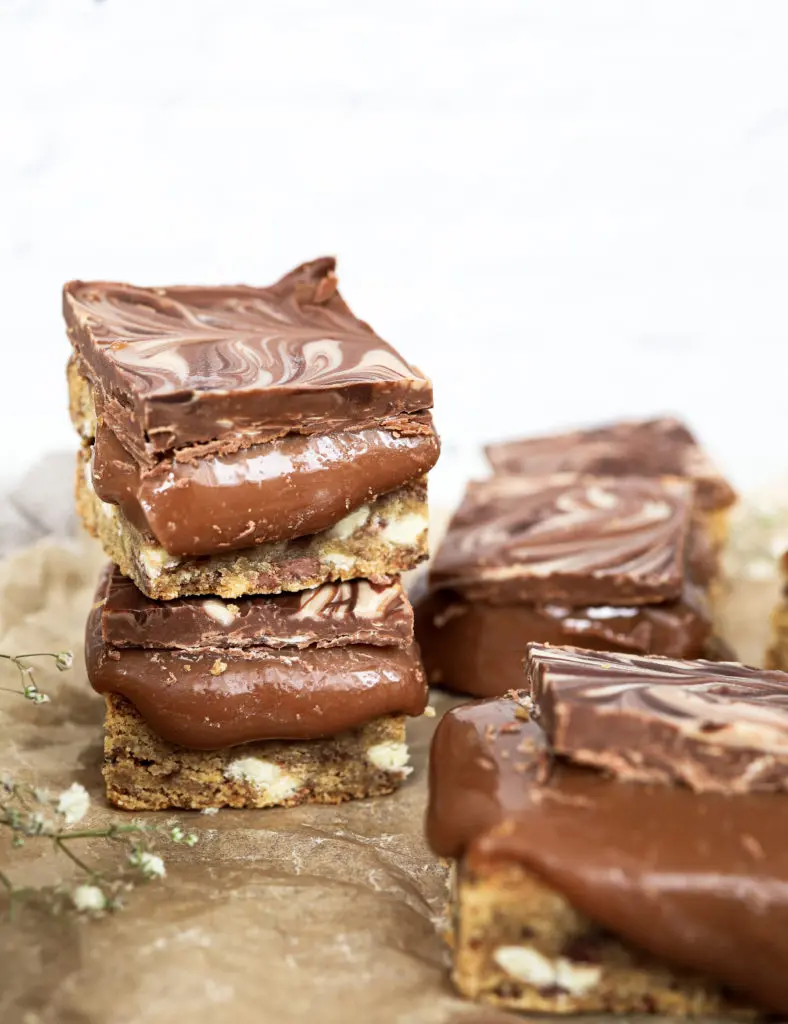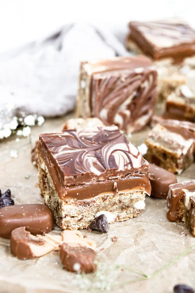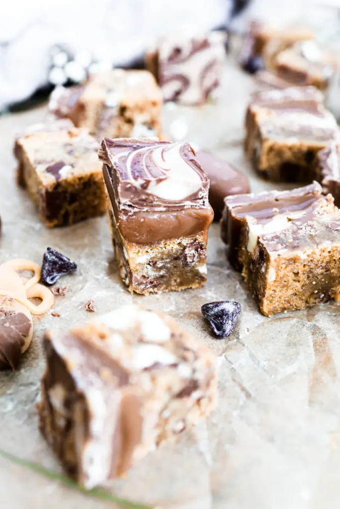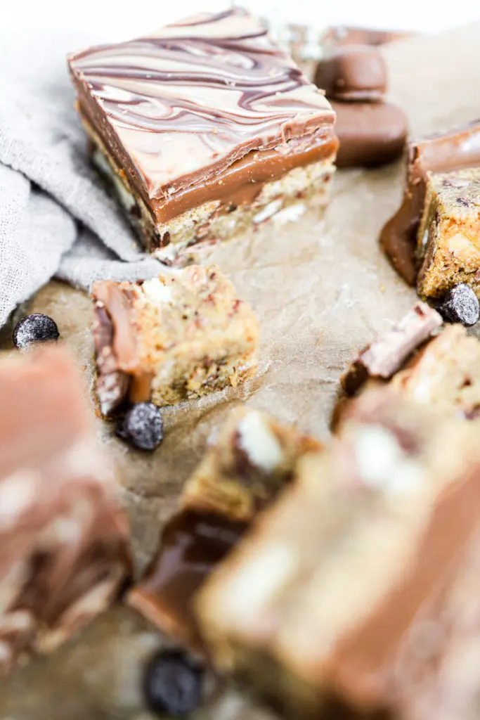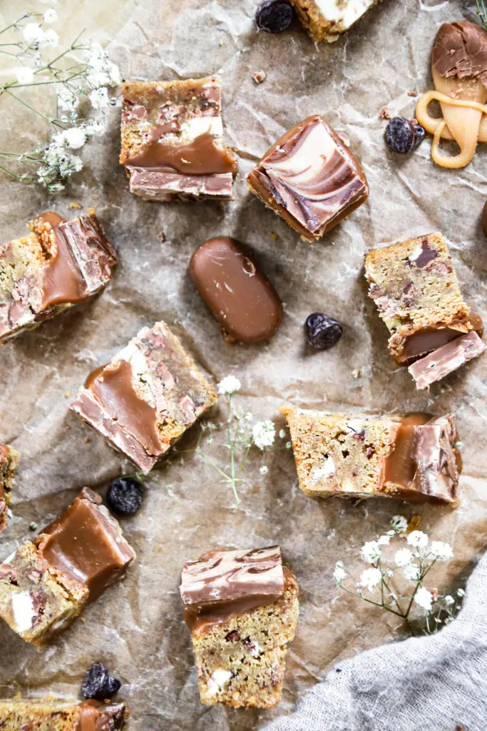 Úff þessir karamellukökubitar eru aðeins of djúsí, löðrandi í karamellu með smákökubita botni og þrenns konar súkkulaði.
