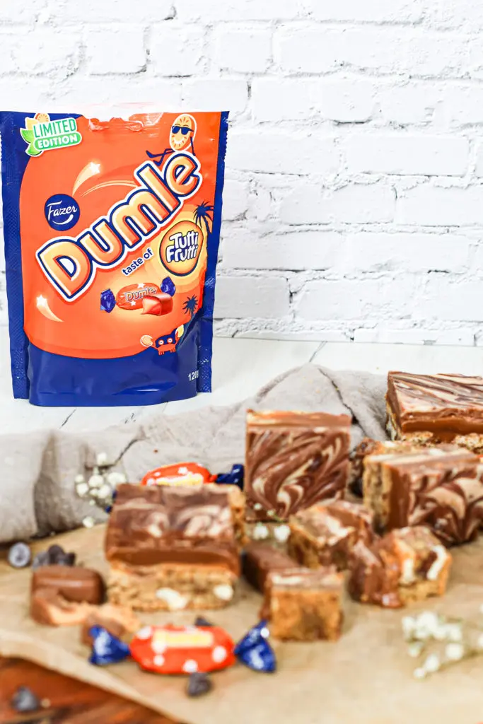 - 5 pakkar eða 600 gr af Dumle karamellum (ég notaði tutti frutti en það má líka nota þessar hefðbundnu ef þið viljið ekki hafa ávaxtakeim)
