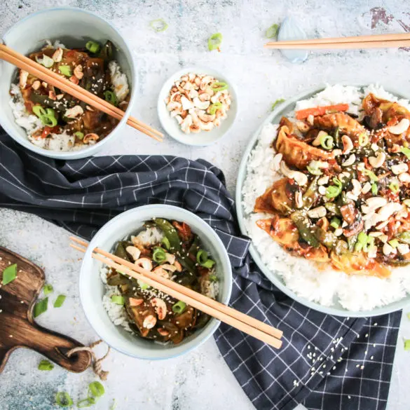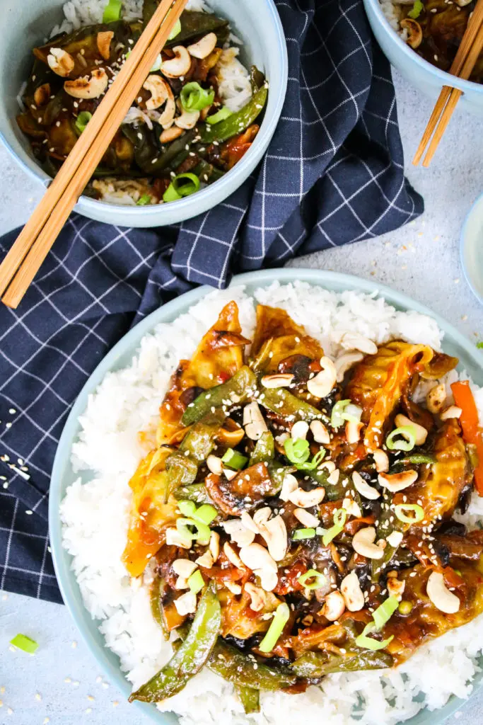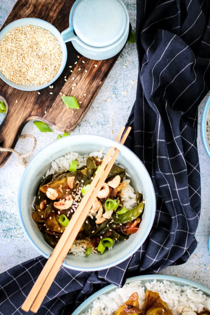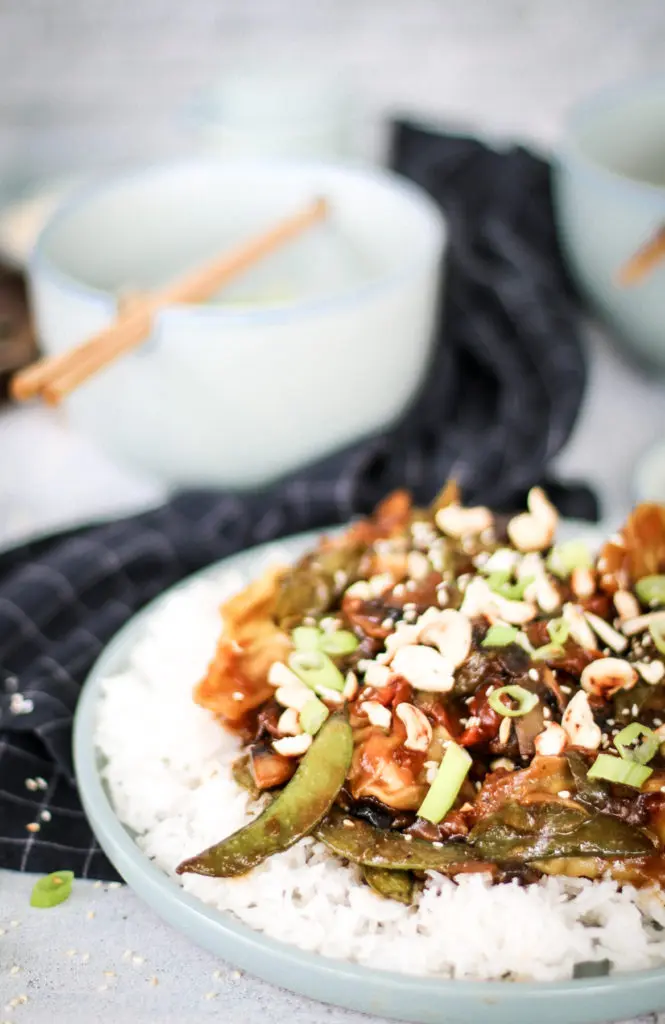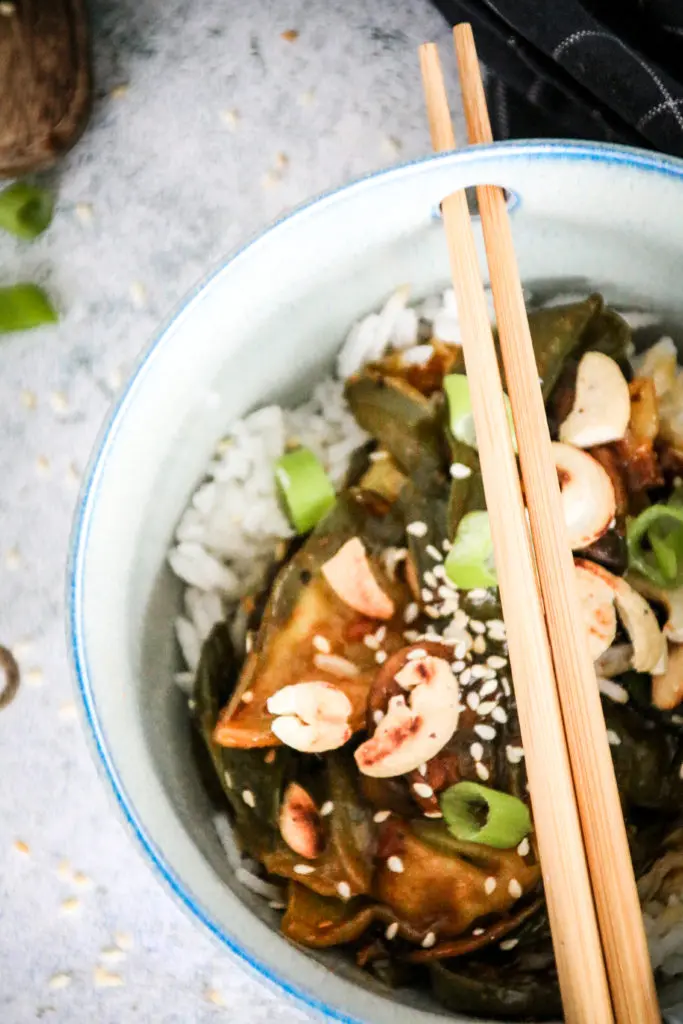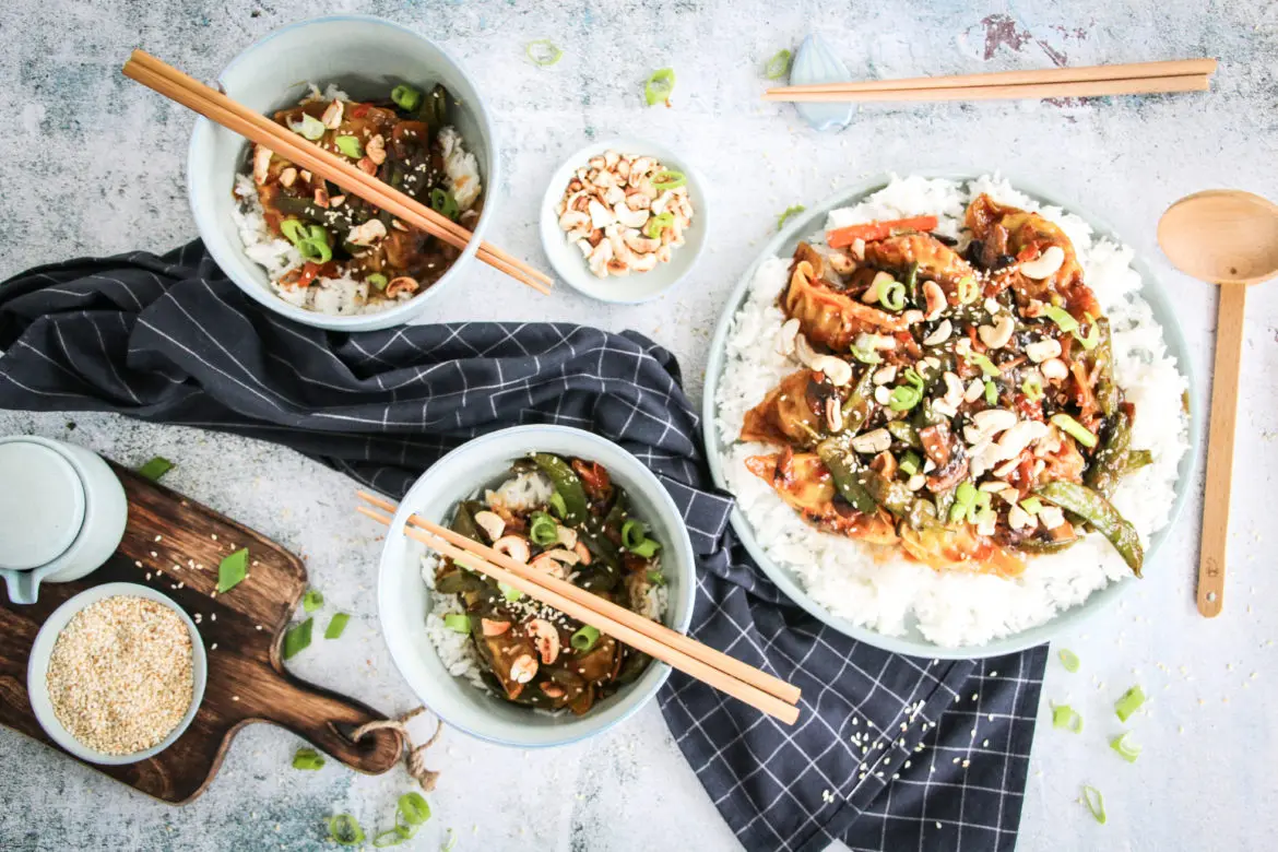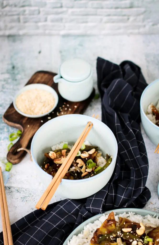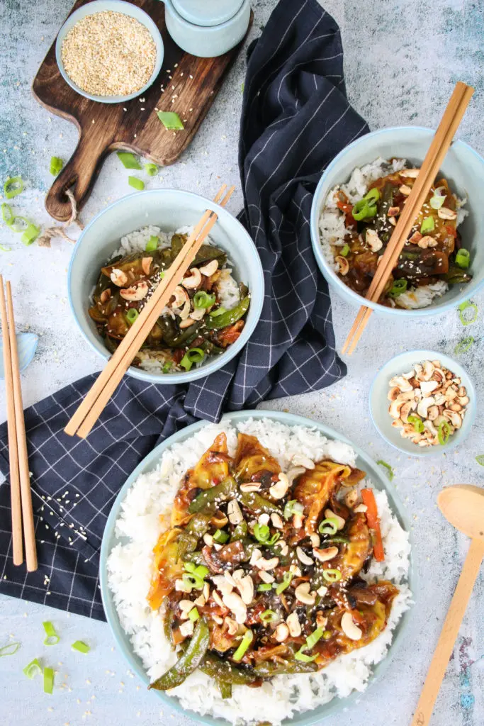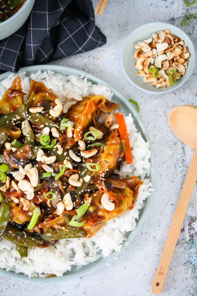 - Berið fram með grjónin undir, réttinn ofan á og toppið með vorlauk, sesamfræjum og kasjú hnetum