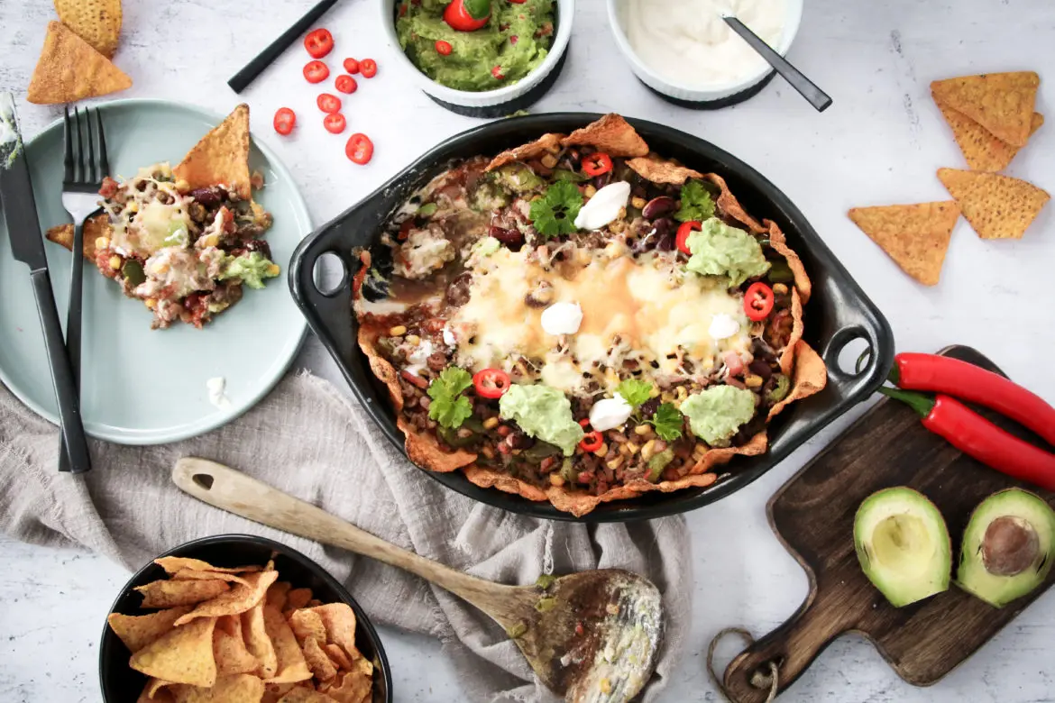 10. Dreifið svo ostunum þremur vel yfir allt og raðið nacho flögum í kringum