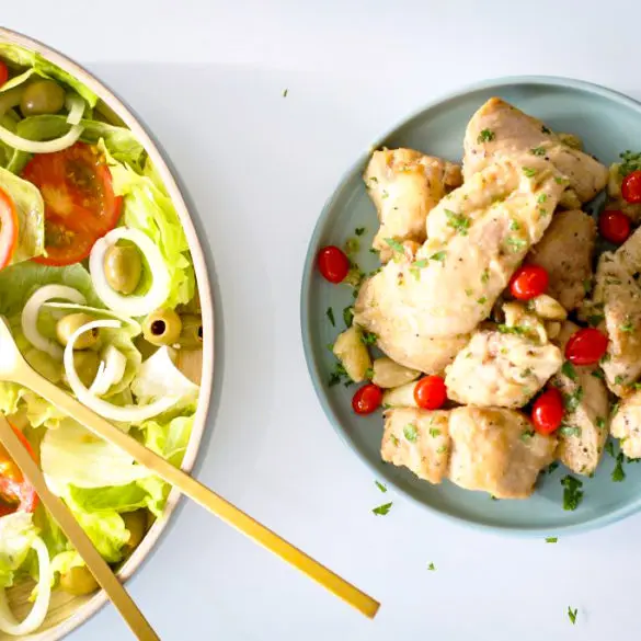 Berið þennan rétt fram með stökku Baguette brauði en það er algjör skylda að dýfa brauðinu út í sósuna sem kemur af kjúllanum.