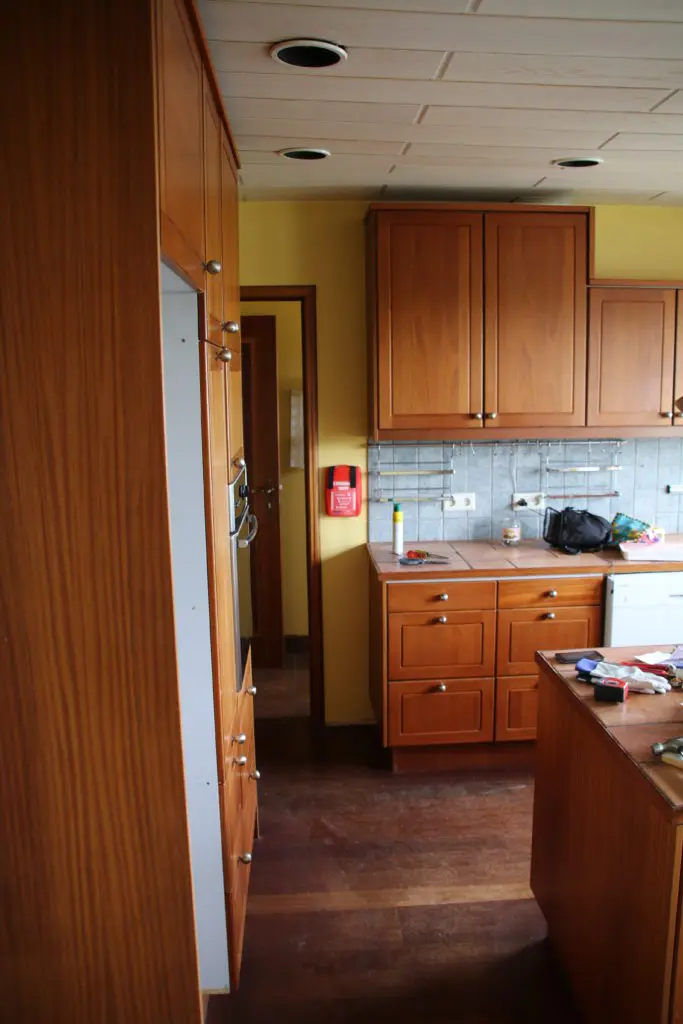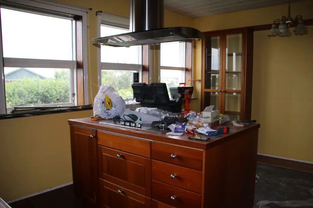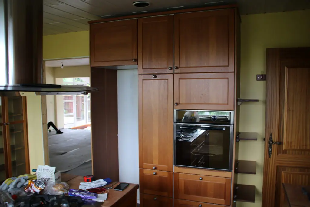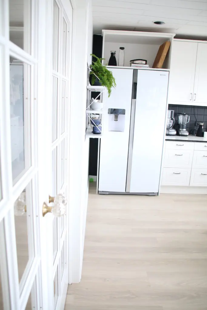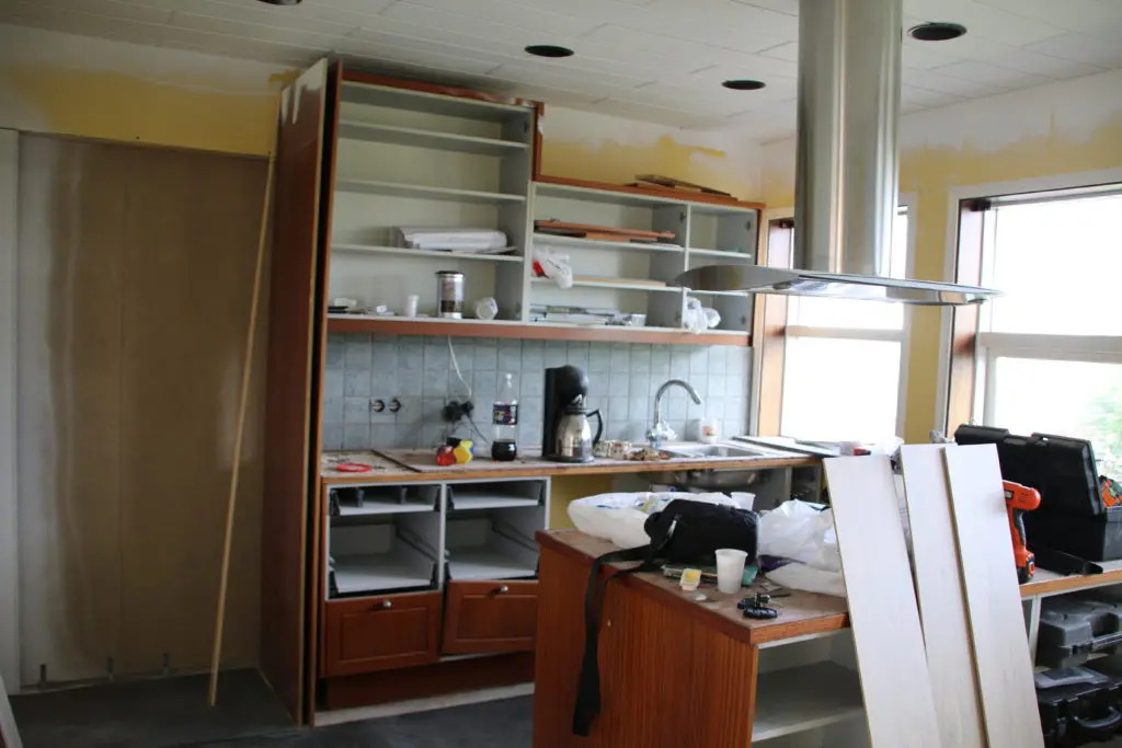 Svo lökkuðum við alla fronta og skápa með rúllu og inni í alla gluggakarma líka. Hér getið þið lesið færslu um hvernig á að lakka eldhúsinnréttingu. Síðan smíðuðum við skáp úr gömlum plötum sem voru til staðar í eldhúsinu utan um ísskápinn. Þetta var alveg rosalega mikil vinna og svona bjuggum við í smátíma meðan við vorum að taka eldhúsið í gegn, þar sem það náðist ekki fyrir flutninginn. Þetta var svoldið skrautlegt og tók heldur betur á taugarnar að vera án eldhús í nokkrar vikur.