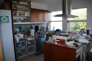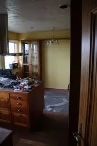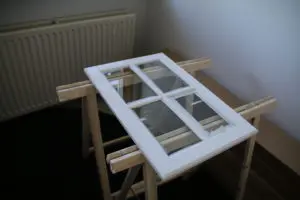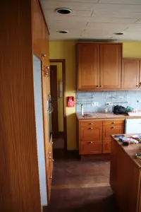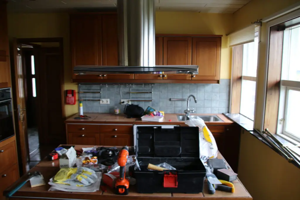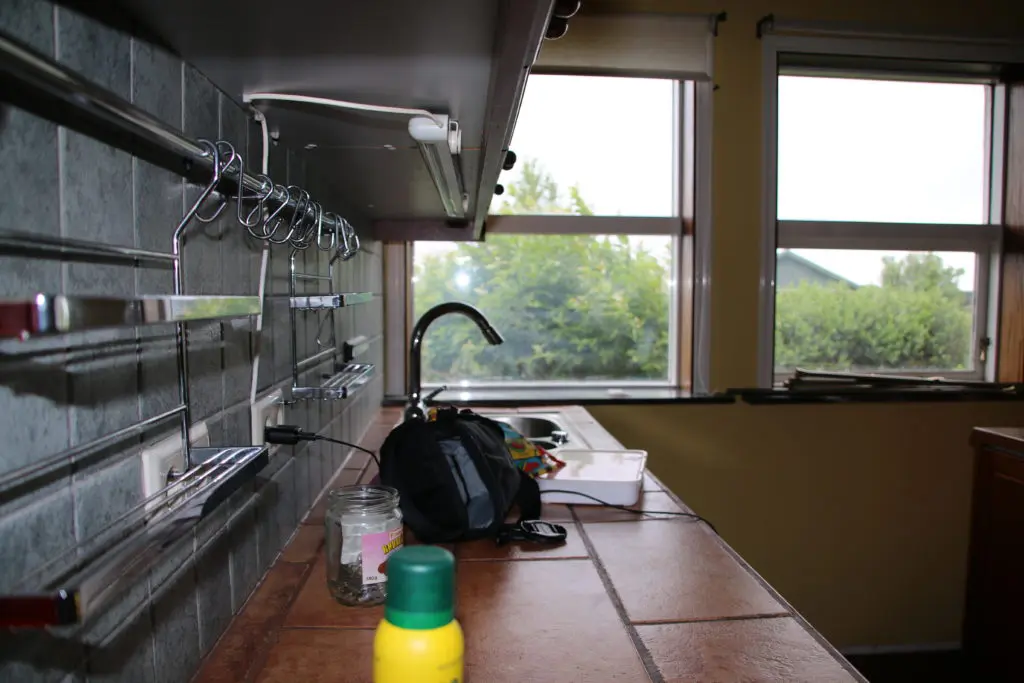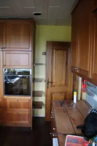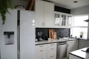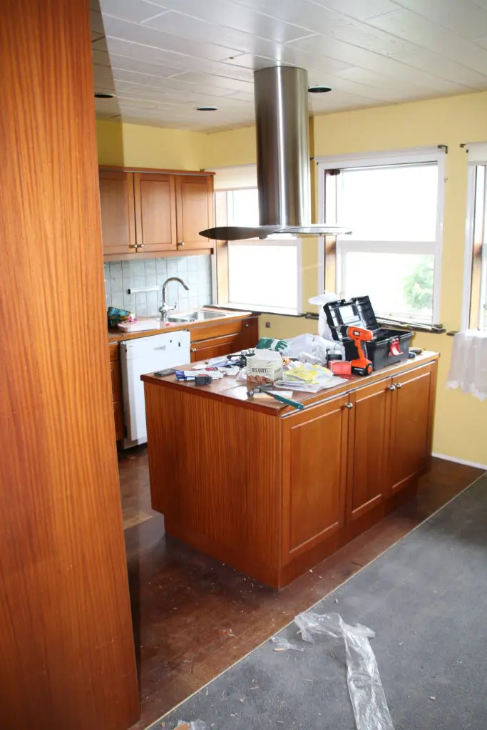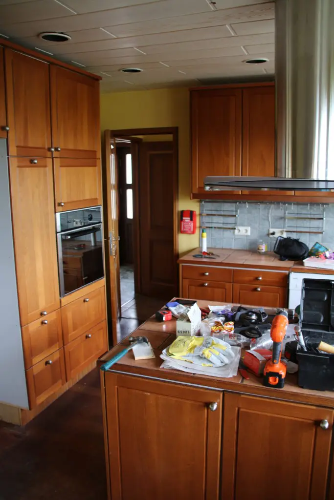 Svo lökkuðum við alla fronta og skápa með rúllu og inni í alla gluggakarma líka. Hér getið þið lesið færslu um hvernig á að lakka eldhúsinnréttingu. Síðan smíðuðum við skáp úr gömlum plötum sem voru til staðar í eldhúsinu utan um ísskápinn. Þetta var alveg rosalega mikil vinna og svona bjuggum við í smátíma meðan við vorum að taka eldhúsið í gegn, þar sem það náðist ekki fyrir flutninginn. Þetta var svoldið skrautlegt og tók heldur betur á taugarnar að vera án eldhús í nokkrar vikur.