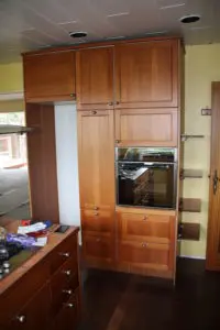Hér sést hvernig við lokuðum hurðinni og byggðum ísskápinn inn í gatið og smíðuðum skáp utan um.
