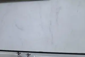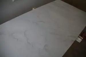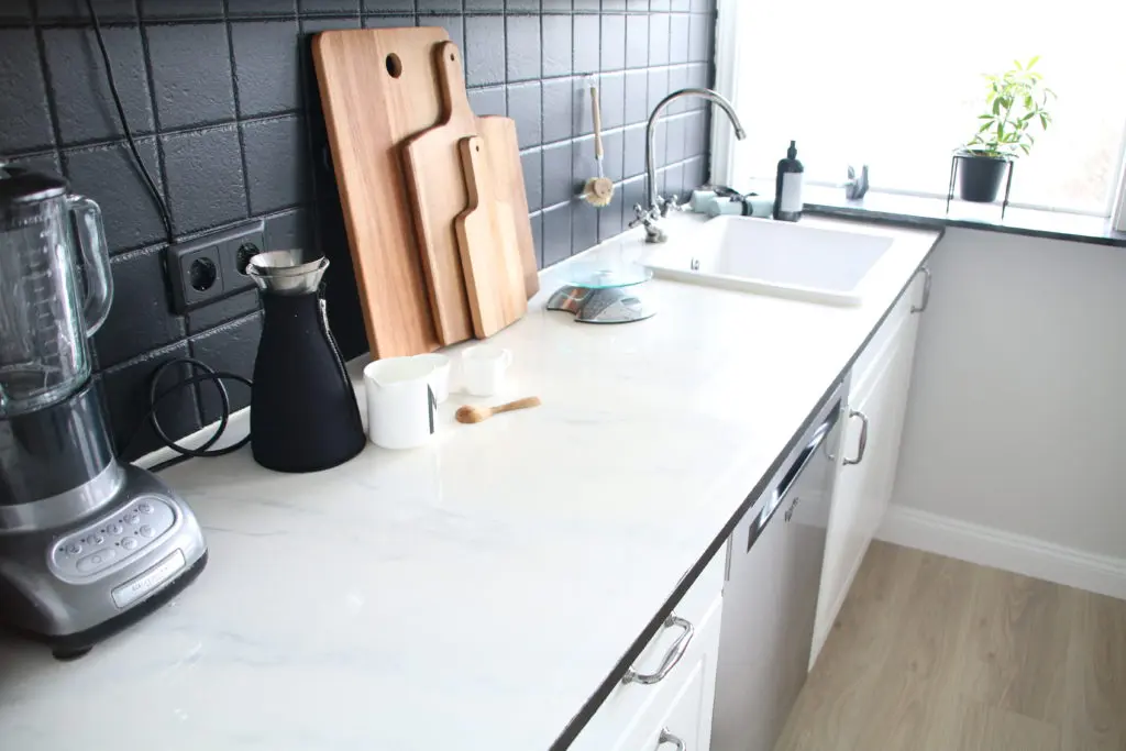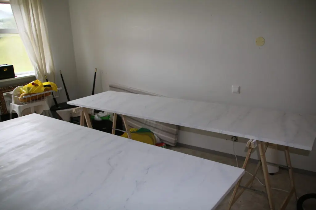 Ég ákvað að gera borðplötur sjálf til að spara sem mestan pening og lét ég því strákana í Bauhaus sníða fyrir mig MDF plötur sem ég síðan málaði eins og marmara. Síðan setti ég tveggja þátta níðsterkt epoxy lakk yfir frá Epoxy Gólfum í Keflavík. Hér má lesa færslu um hvernig borðplöturnar voru gerðar, en það er vel hægt að sleppa við undir 20.000 kr fyrir svona borðplötur.