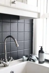 Hér sest ofan á borðplötuna, svörtu flísarnar sem við máluðum og í nýja vaskinn.