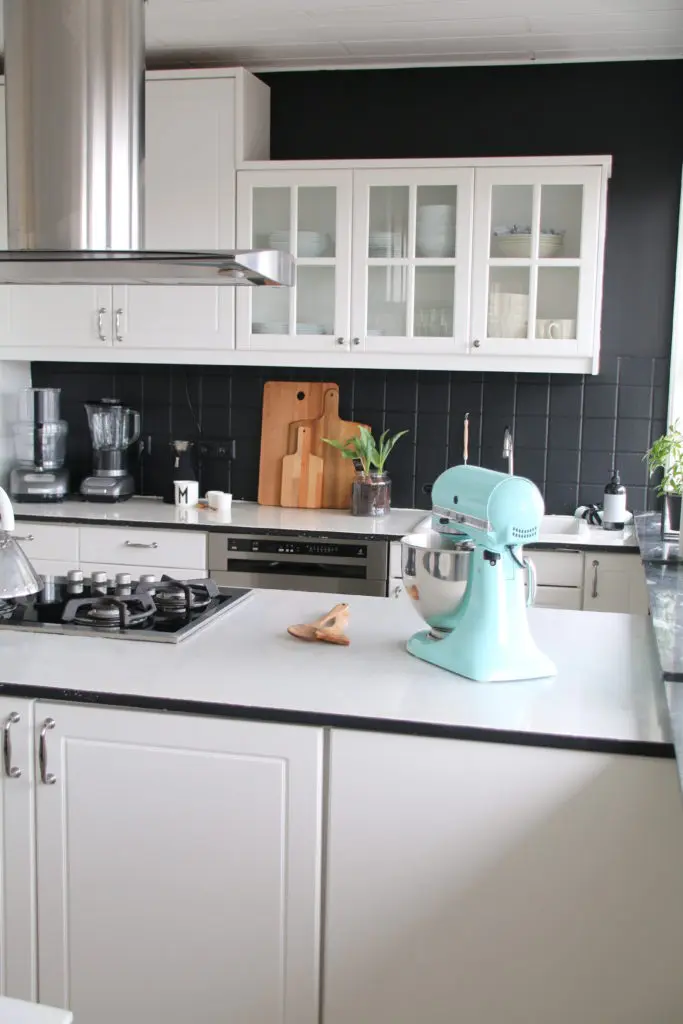 Hér sést hvernig borðplatan kemur út. Mér fannst fallegt að lakka svarta rönd framan á hana til að fá heildarlúkk á eldhúsið.
