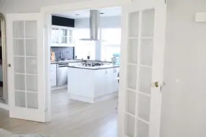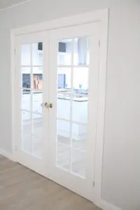 Á veggnum við hliðina á innganginum í eldhúsið var stór búrskápur, bakaraofn og ísskápsskápur. Við tókum þetta allt niður þar sem okkur fannst þetta vera allt of kaótískt og þrengja gangveginn í eldhúsinu. Markmiðið var að stækka upp og birta til í rýminu. Á neðri myndinni sést tvöföld hurð inn í eldhúsið og virkar hún mjög stór. Sannleikurinn er hins vegar sá að hún var ekki nema 112 cm á breidd og mjög þröng fyrir tvöfalda hurð. Við ákváðum því að stækka hurðargatið og létum sérsmíða franska hurð inn í eldhús, sem er 170 cm breið. Það gerði rosa mikið fyrir bæði stofuna og eldhúsið.