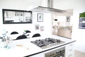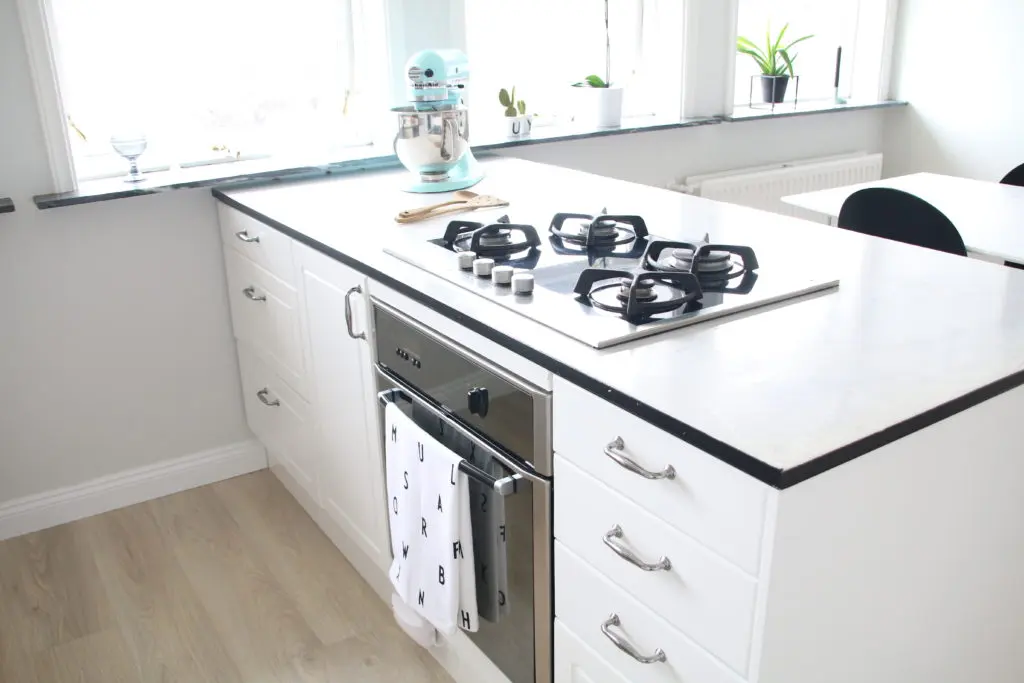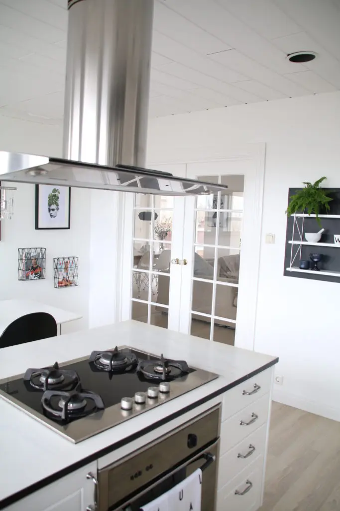 Við notuðumst við bakaraofninn, eldavélina og háfinn sem var til staðar, enda leit það vel út og var í góðu ástandi. Við færðum ofninn af stóra veggnum og undir eldavélina. Einnig er búið að lengja hér eyjuna út að glugga og setja þar skúffur og skáp hinum megin við.