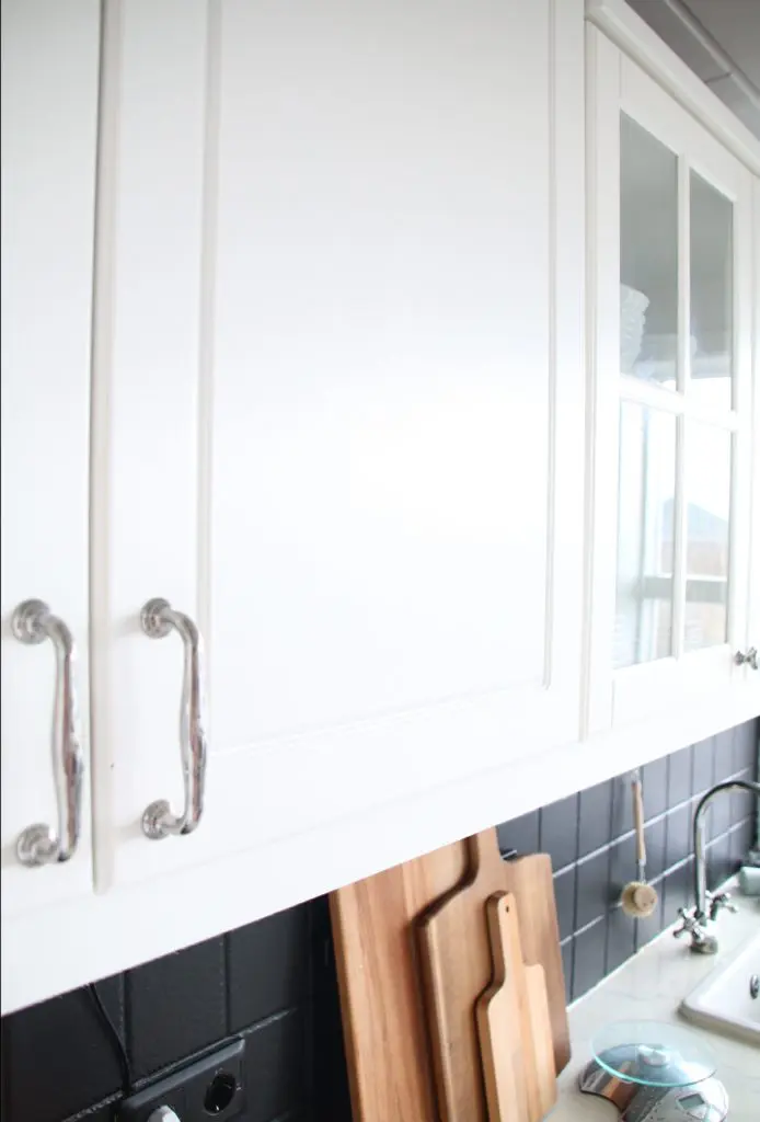 Lakkið á frontunum kom mjög vel út þrátt fyrir að hafa verið lakkað með rúllu. Áferðin er eins og ef hún hefði verið sprautuð, en ég notaði sérstaka lakkrúllu úr Bauhaus til að fá þessa góðu áferð. Fyrst er samt alltaf að grunna vel undir. Einnig skiptum við út höldunum á skápunum en þessar eru keyptar í Ikea og kostuðu mjög lítið, 2 saman í pakka.