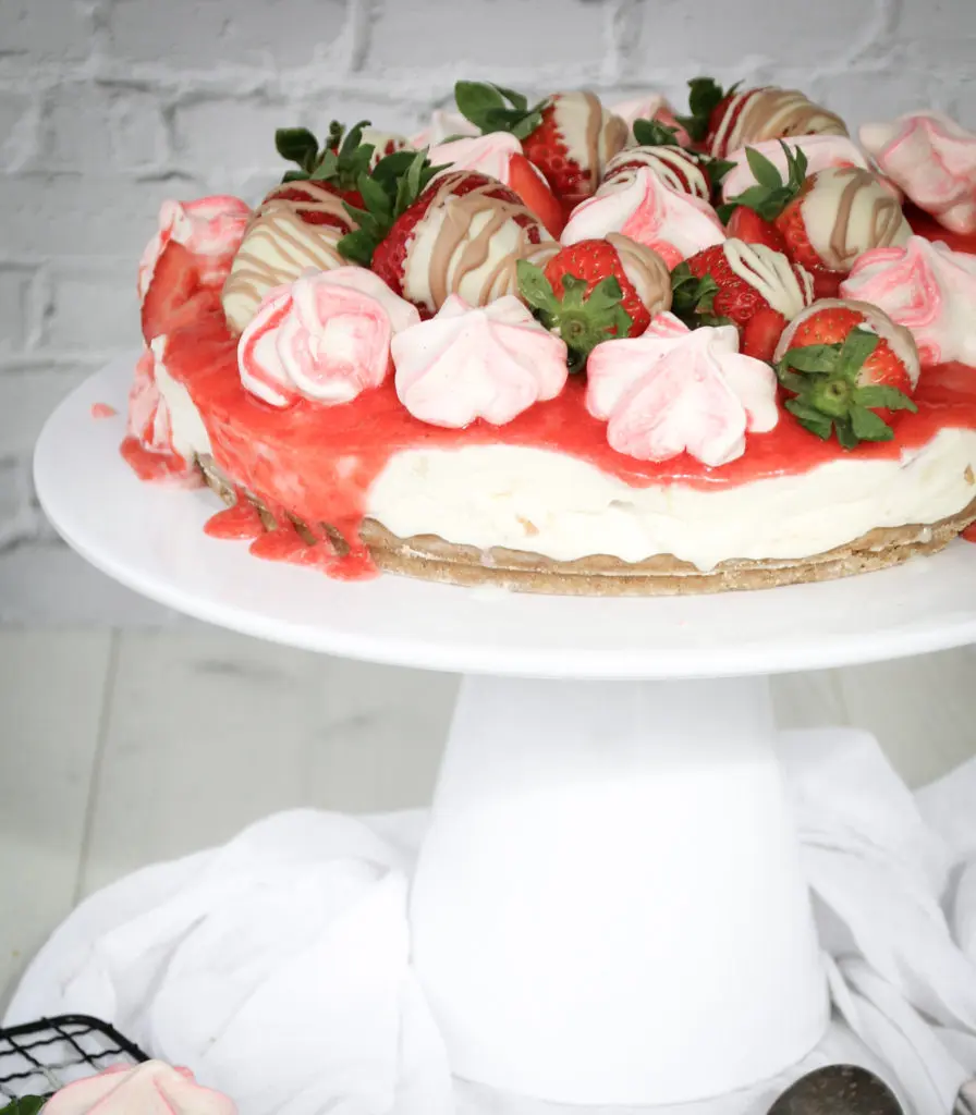 - Hellið jarðaberjasósunni ofan á hana í þunnu lagi og skiljið smá eftir til að hafa í skál til að bera með kökunni