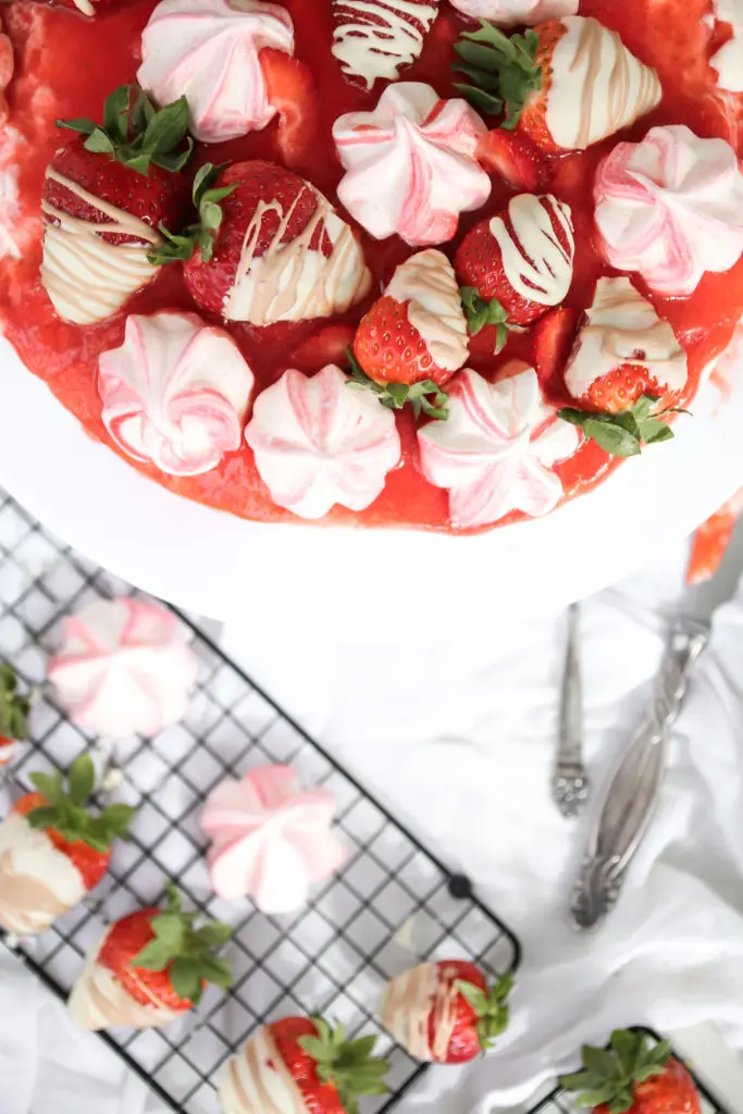 - Raðið svo súkkaulaðihúðuðu jarðaberjunum og marenstoppunum yfir hana og berið fram