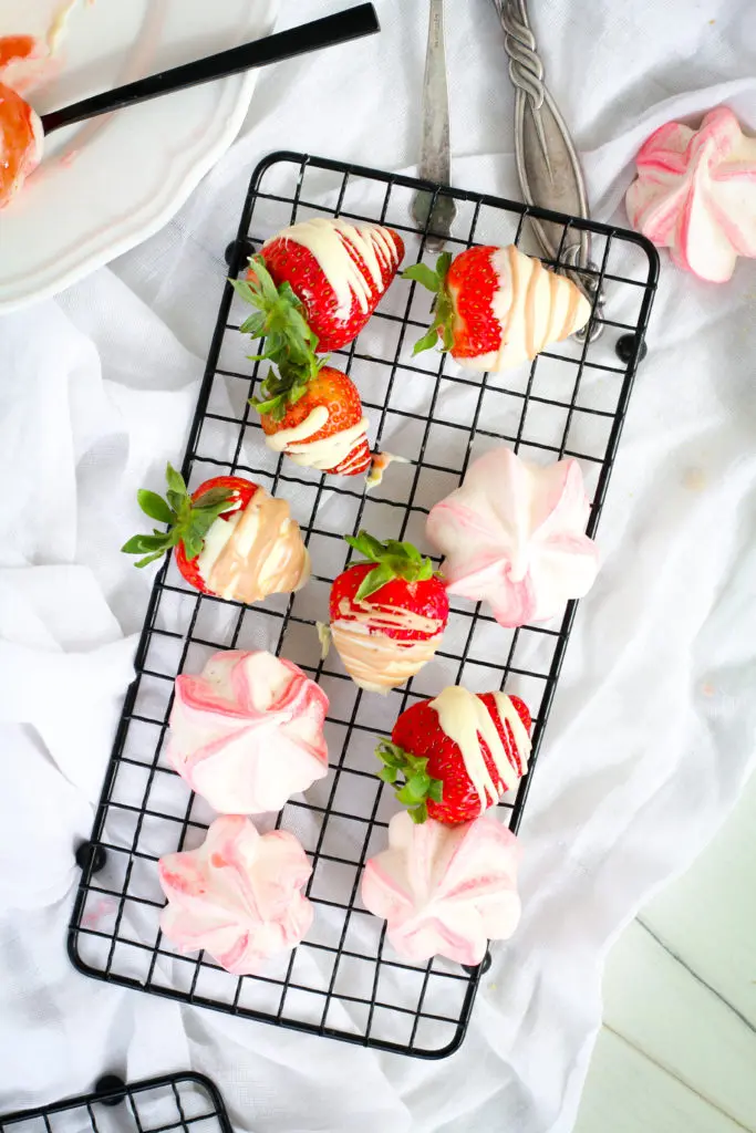 - Þvoið jarðaberin og þurrrkið vel og dífið að hluta ofan í hvíta súkkulaðið